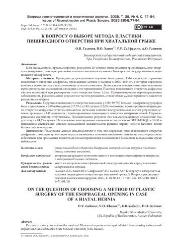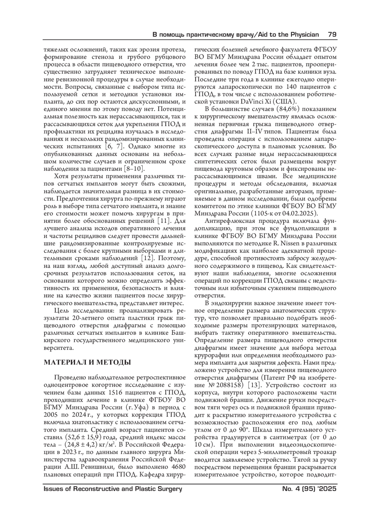 Цель исследования: проанализировать результаты 20-летнего опыта пластики грыж пищеводного отверстия диафрагмы с помощью различных сетчатых имплантов в клинике Башкирского государственного медицинского университета.