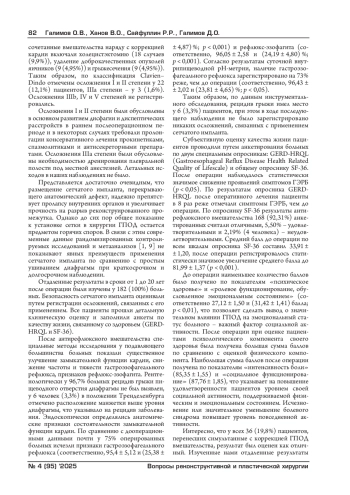 Результаты. Коррекция пищеводного отверстия выполнена у 450 (29,7%) больных: диафрагмокрурорафия была осуществлена в 268 наблюдениях (17,7%), в 182 случаях (12,0%) выполнено протезирование пищеводного отверстия диафрагмы сетчатым имплантом. Детальная клинико-инструментальная оценка результатов лечения проведена у 182 пациентов с протезированием пищеводного отверстия диафрагмы сеткой. Периоперационная смертность отсутствовала. Положительный результат без послеоперационных осложнений был достигнут в 94,5% случаев. На основании анкетирования пациентов по опросникам GERD-HRQL и SF-36 и применения специальных методов исследования замыкательной функции кардии изучено качество жизни больных после операции.