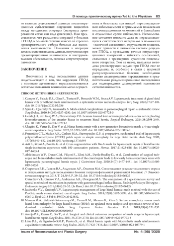 4. Ukegjini K., Vetter D., Dirr V. et al. Hiatus hernia repair with a new-generation biosynthetic mesh: a 4-year singlecenter experience. Surg Endosc. 2023;37:5295-5302. DOI: 10.1007/s00464-023-10005-0