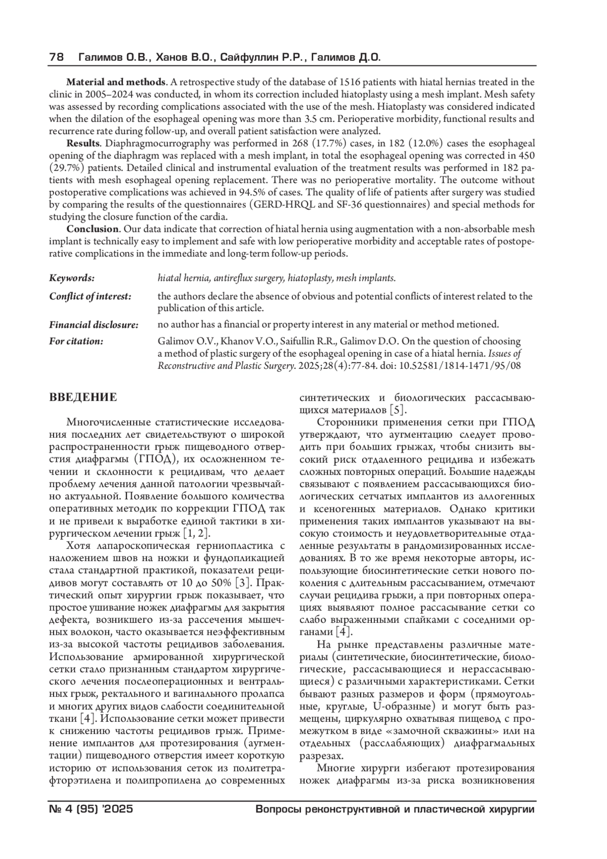 Материал и методы. Проведено ретроспективное изучение базы данных 1516 пациентов с грыжами пищеводного отверстия диафрагмы, проходивших лечение в клинике в 2005–2024 гг., у которых коррекция включала хиатопластику с использованием сетчатого импланта. Безопасность сетчатого импланта оценивали путем регистрации осложнений, связанных с его применением. Пластику пищеводного отверстия диафрагмы считали показанной при расширении этого отверстия более 3,5 см. Проанализированы периоперационная заболеваемость, функциональные результаты и частота рецидивов, а также общая удовлетворенность пациентов результатами лечения.