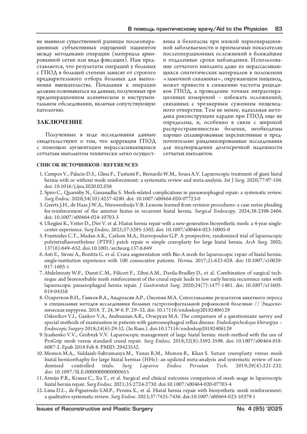12. Lima D.L., de Figueiredo S.M.P., Pereira X., et al. Hiatal hernia repair with biosynthetic mesh reinforcement: a qualitative systematic review. Surg Endosc. 2023;37:7425-7436. DOI: 10.1007/s00464-023-10379-1