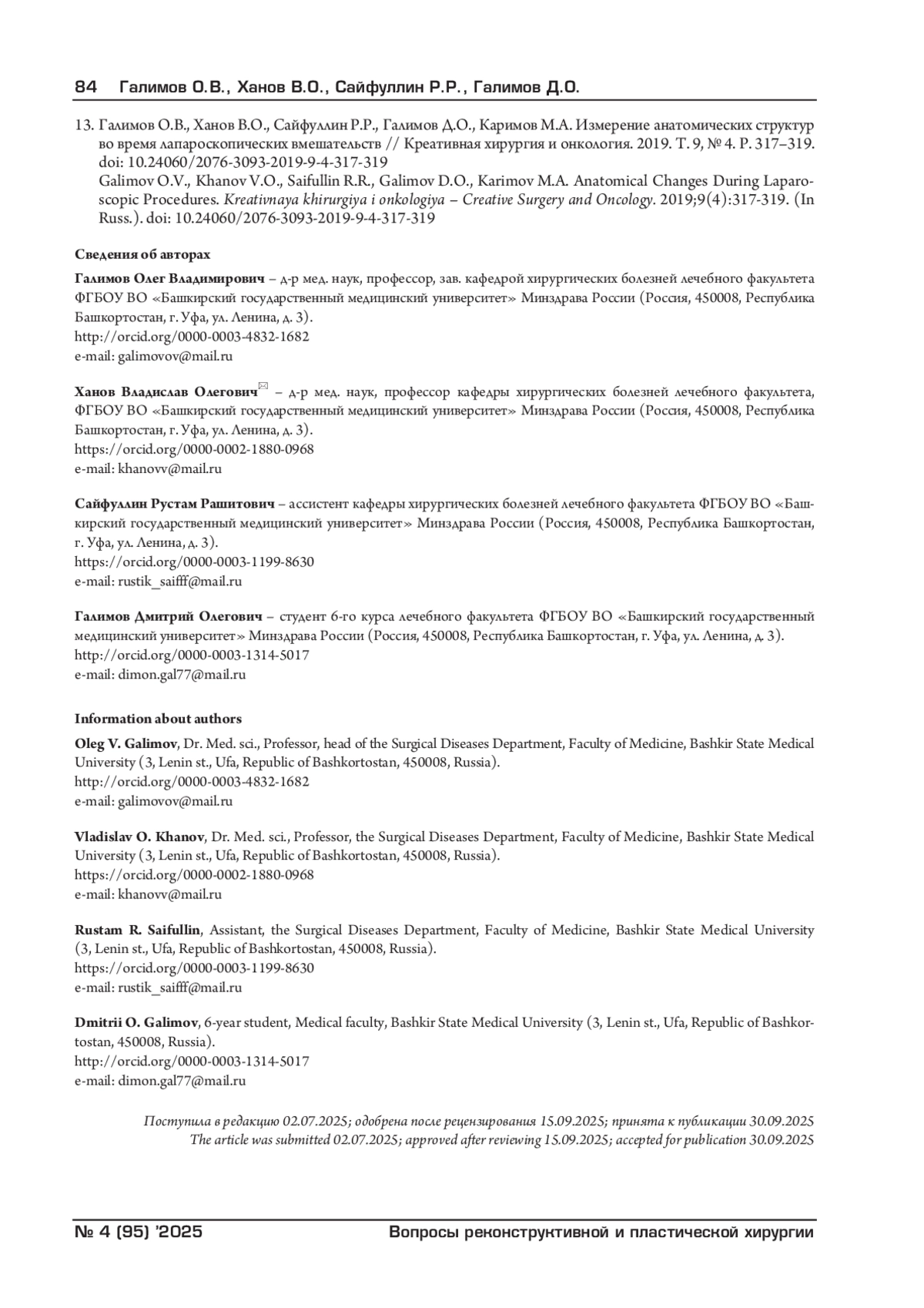 13. Галимов О.В., Ханов В.О., Сайфуллин Р.Р., Галимов Д.О., Каримов М.А. Измерение анатомических структур во время лапароскопических вмешательств // Креативная хирургия и онкология. 2019. Т. 9, № 4. Р. 317-319.