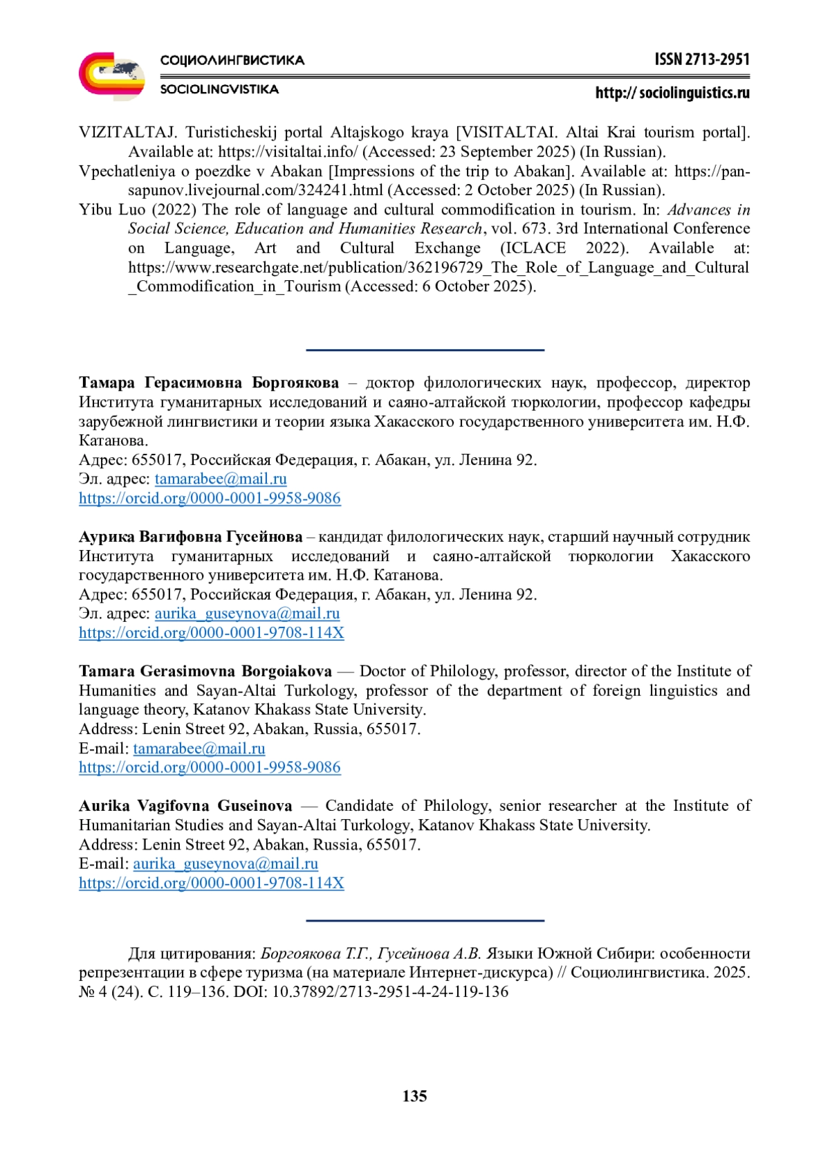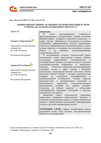 В исследованном сегменте туристической сферы региональные языки представлены главным образом отдельными вкраплениями топонимической и этнографической лексики, хотя присутствуют и элементы этнолингвистической информации и двуязычного дискурса. Отмечается корреляция функционирования указанных языков в сфере туризма с базовыми константами социолингвистической типологии языков республик Южной Сибири, в которой тувинский язык лидирует по показателям демографической и коммуникативной устойчивости. Отзывы туристов свидетельствует о противоречивом отношении к интенсивности проявления этнолингвистического регионального колорита. Его дефицит вызывает сожаление, но избыток приводит к субъективно дискомфортному ощущению отчуждения в пределах собственного государства.