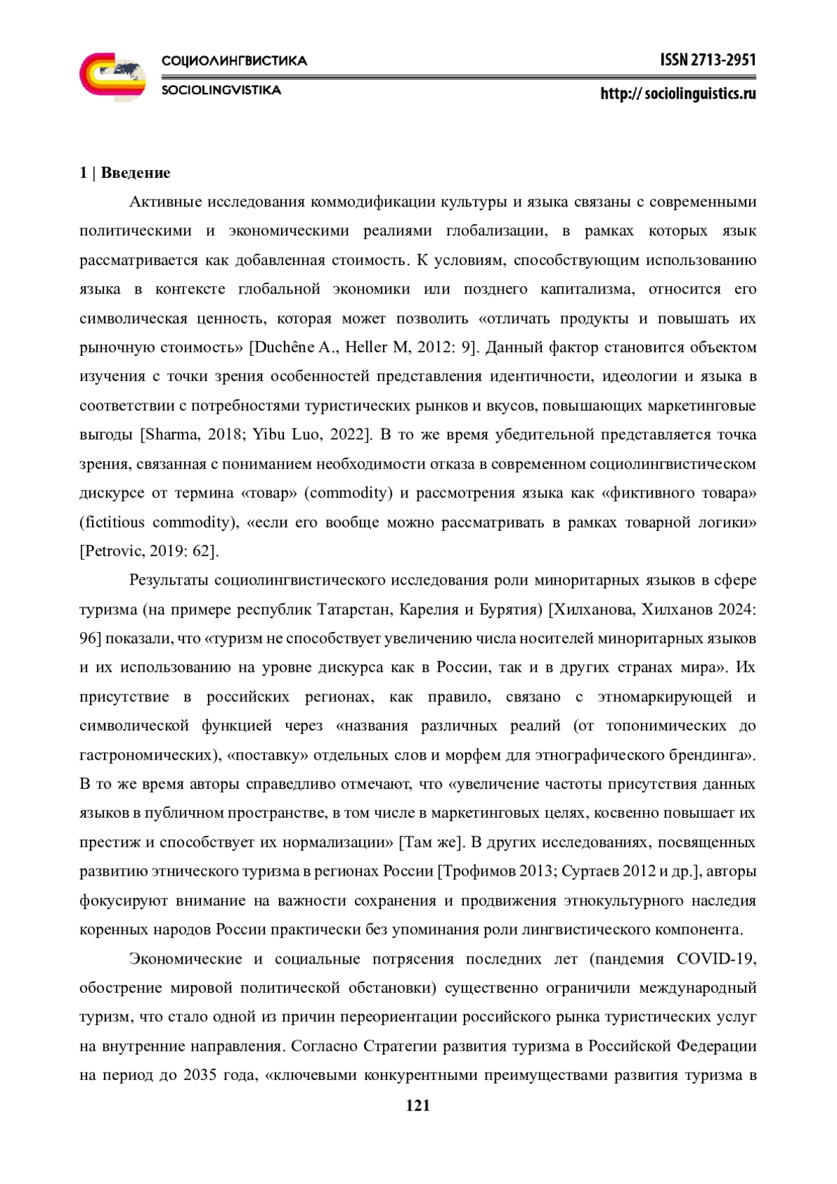 Активные исследования коммодификации культуры и языка связаны с современными политическими и экономическими реалиями глобализации, в рамках которых язык рассматривается как добавленная стоимость. К условиям, способствующим использованию языка в контексте глобальной экономики или позднего капитализма, относится его символическая ценность, которая может позволить «отличать продукты и повышать их рыночную стоимость» [Duchêne A., Heller M, 2012: 9]. Данный фактор становится объектом изучения с точки зрения особенностей представления идентичности, идеологии и языка в соответствии с потребностями туристических рынков и вкусов, повышающих маркетинговые выгоды [Sharma, 2018; Yibu Luo, 2022]. В то же время убедительной представляется точка зрения, связанная с пониманием необходимости отказа в современном социолингвистическом дискурсе от термина «товар» (commodity) и рассмотрения языка как «фиктивного товара» (fictitious commodity), «если его вообще можно рассматривать в рамках товарной логики» [Petrovic, 2019: 62].