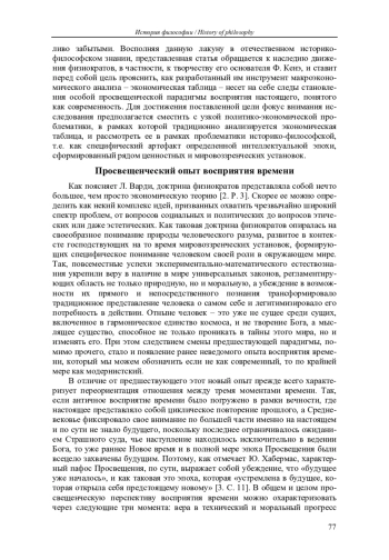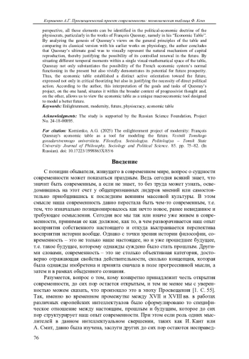 В статье анализируется представление о современности как о философском концепте, разработанном в рамках просвещенческой парадигмы восприятия времени и характеризующемся через три ключевых момента: прогрессизм, активная ориентация по отношению к будущему, одновременность разновременного; а также демонстрируется, как эта специфическая парадигма реализуется в общем принципе работы экономической таблицы Ф. Кенэ.