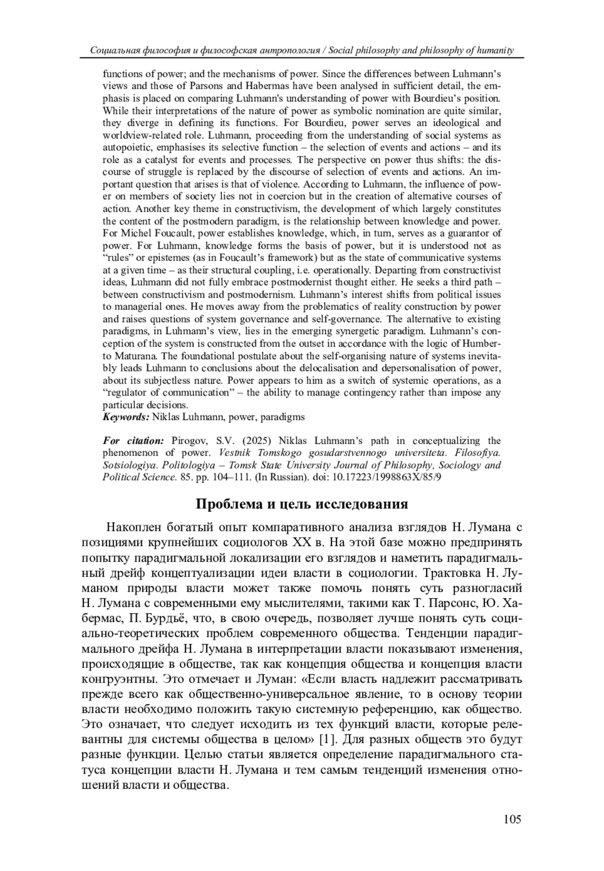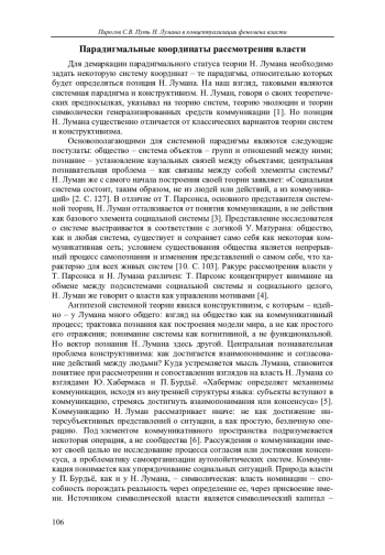 Накоплен богатый опыт компаративного анализа взглядов Н. Лумана с позициями крупнейших социологов ХХ в. На этой базе можно предпринять попытку парадигмальной локализации его взглядов и наметить парадигмальный дрейф концептуализации идеи власти в социологии.