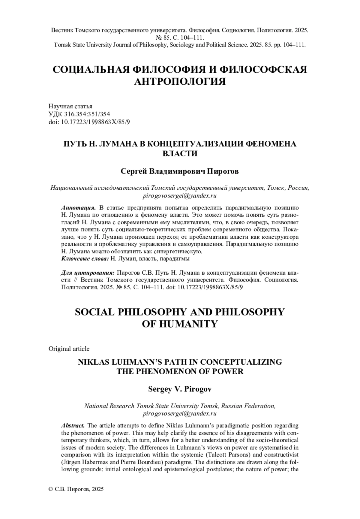 В статье предпринята попытка определить парадигмальную позицию Н. Лумана по отношению к феномену власти. Это может помочь понять суть разногласий Н. Лумана с современными ему мыслителями, что, в свою очередь, позволяет лучше понять суть социально-теоретических проблем современного общества. Показано, что у Н. Лумана произошел переход от проблематики власти как конструктора реальности в проблематику управления и самоуправления. Парадигмальную позицию Н. Лумана можно обозначить как синергетическую.