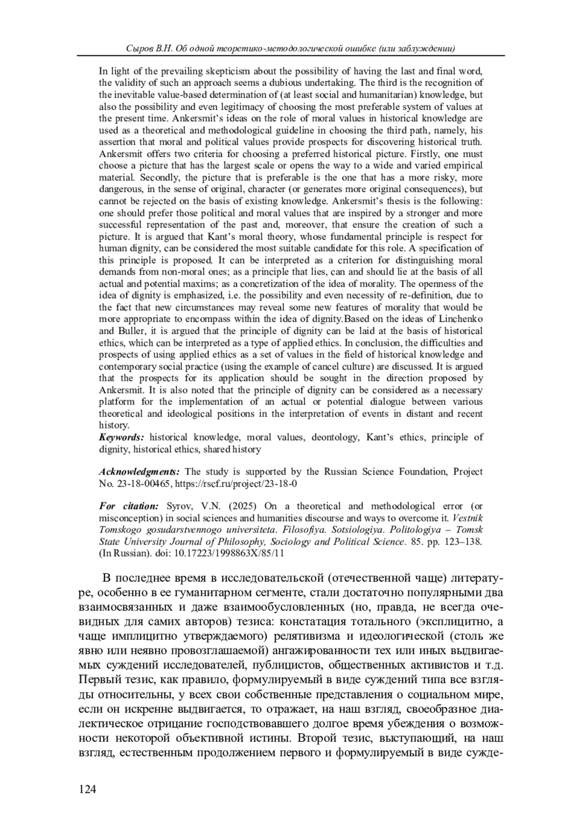 В статье обсуждаются два популярных взаимосвязанных и взаимообусловленных тезиса: констатация тотального релятивизма и утверждение об идеологической ангажированности выдвигаемых суждений исследователей, публицистов и общественных активистов. В качестве теоретико-методологического ориентира решения проблемы используются идеи Анкерсмита о роли моральных ценностей в историческом познании, а именно его утверждение, что моральные и политические ценности обеспечивают нам путь открытия исторической истины. Поэтому Анкерсмит предлагает два критерия выбора предпочтительных ценностей: надлежит выбрать те ценности, что открывают путь для создания наиболее широкой исторической картины и картины, обладающей оригинальным характером. В заключение обосновывается тезис о роли кантовской идеи уважения к достоинству как приоритетного кандидата на роль такой системы ценностей и обсуждаются ее перспективы в исторической этике.