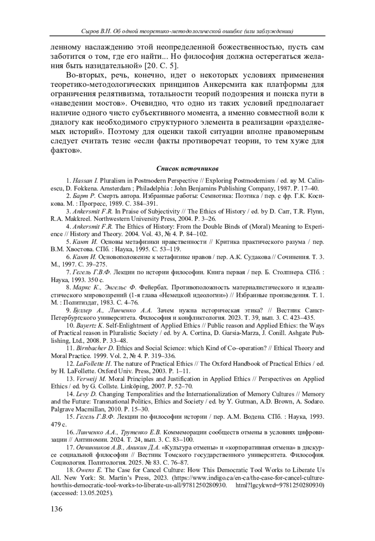 3. Ankersmit F.R. In Praise of Subjectivity // The Ethics of History / ed. by D. Carr, T.R. Flynn, R.A. Makkreel. Northwestern University Press, 2004. P. 3-26.