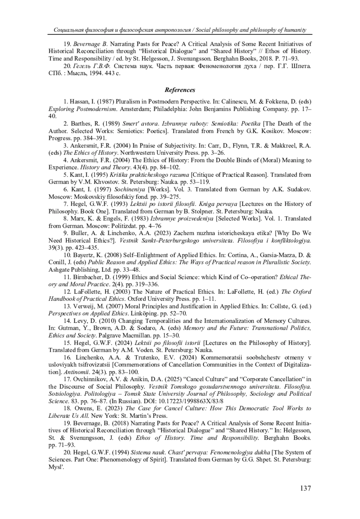 9. Буллер А., Линченко А.А. Зачем нужна историческая этика? // Вестник Санкт-Петербургского университета. Философия и конфликтология. 2023. Т. 39, вып. 3. С. 423-435. EDN: GYFXWN