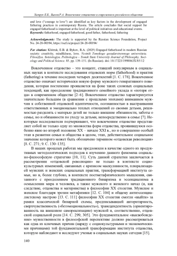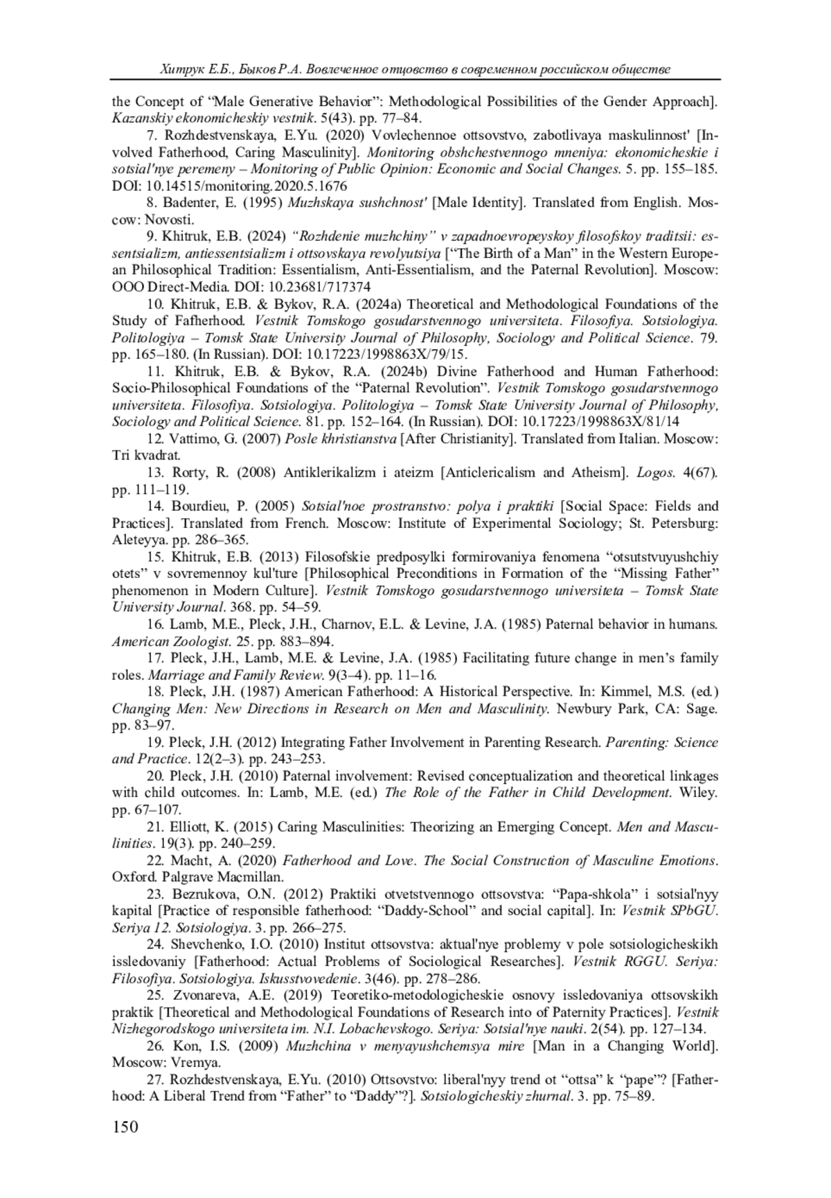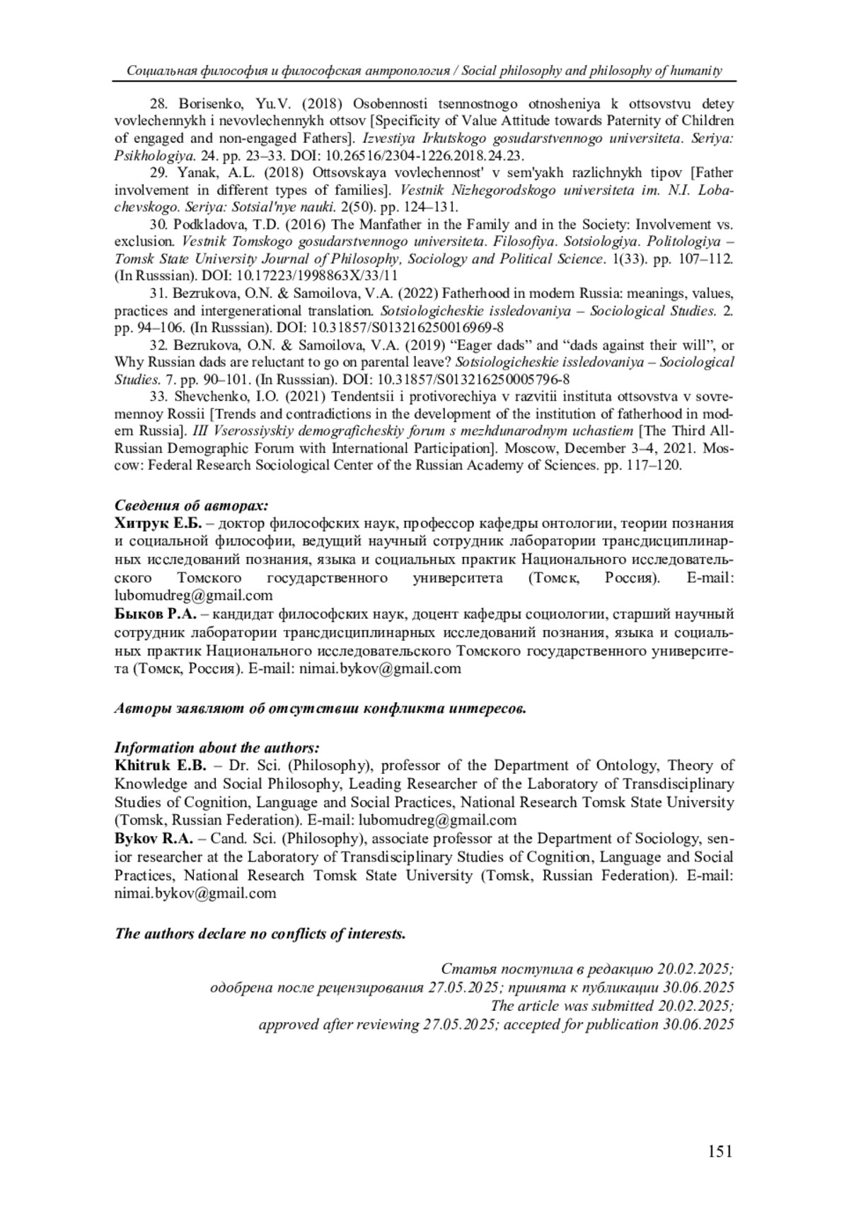 10. Хитрук Е.Б., Быков Р.А. Теоретико-методологические основания исследования отцовства // Вестник Томского государственного университета. Философия. Социология. Политология. 2024. № 79. С. 165-180. DOI: 10.17223/1998863X/79/15 EDN: NLXRNO