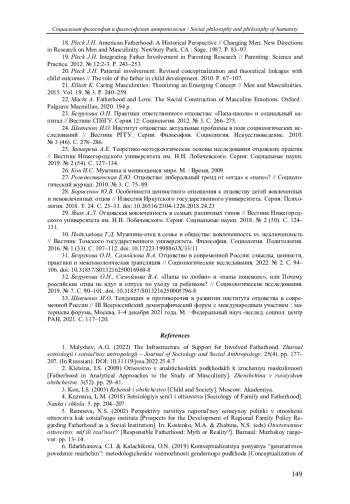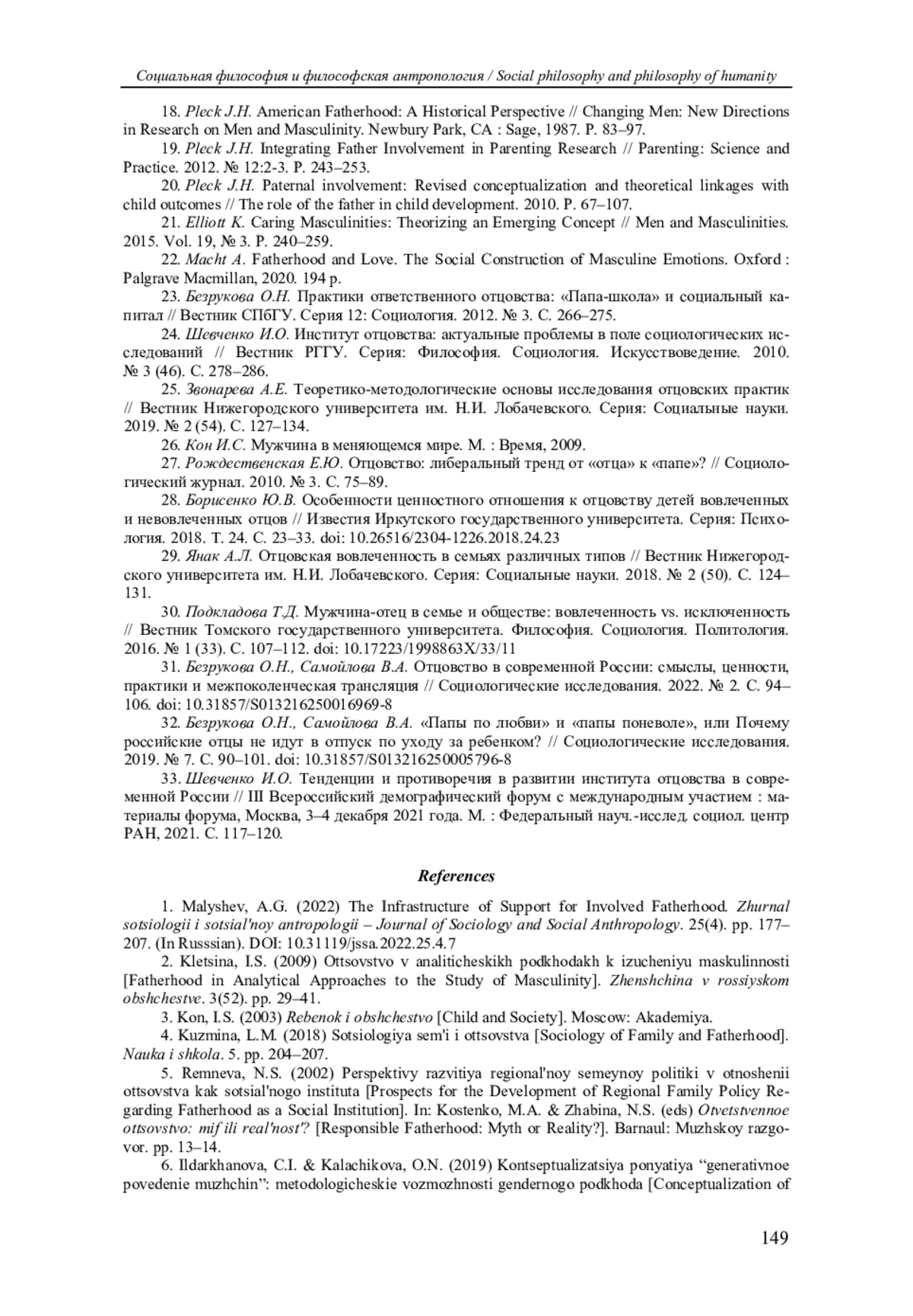 1. Малышев А.Г. Инфраструктура поддержки вовлеченного отцовства // Журнал социологии и социальной антропологии. 2022. Т. 25, № 4. С. 177-207. DOI: 10.31119/jssa.2022.25.4.7 EDN: LPKYTB