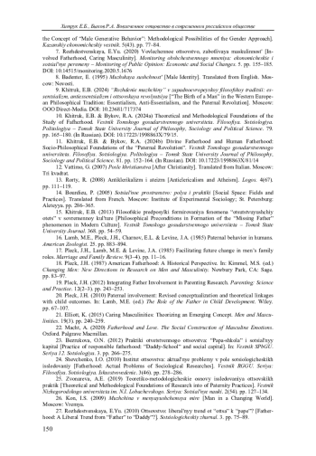 7. Рождественская Е.Ю. Вовлеченное отцовство, заботливая маскулинность // Мониторинг общественного мнения: экономические и социальные перемены. 2020. № 5. С. 155-185. DOI: 10.14515/monitoring.2020.5.1676 EDN: DMPPZW