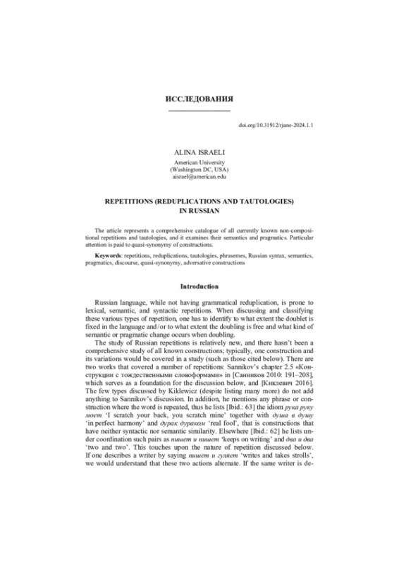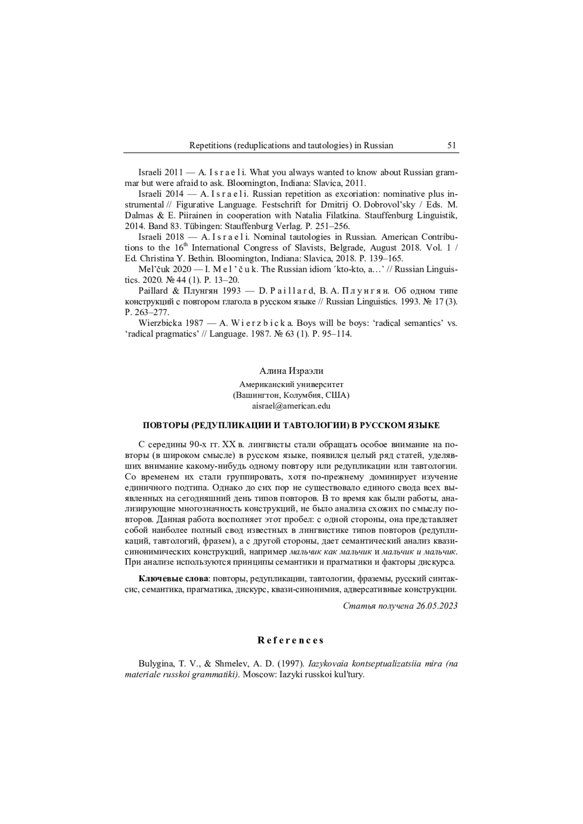 19. Israeli 2018 - A. Israeli. Nominal tautologies in Russian. American Contributions to the 16th International Congress of Slavists, Belgrade, August 2018. Vol. 1 / Ed. Christina Y. Bethin. Bloomington, Indiana: Slavica, 2018. P. 139-165.