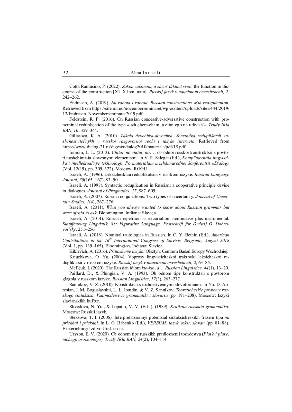 15. Israeli 1997 - A. Israeli. Syntactic reduplication in Russian: a cooperative principle device in dialogues // Journal of Pragmatics. 1997. 27. P. 587-609. EDN: AIZOAH