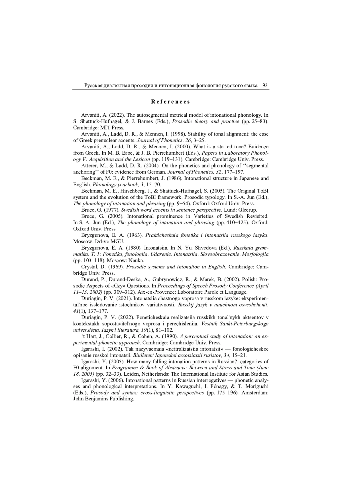 37. Igarashi 2006 - Y. Igarashi.Intonational patterns in Russian interrogatives - phonetic analyses and phonological interpretations // Prosody and syntax: cross-linguistic perspectives / Y. Kawaguchi, I. Fónagy, T. Moriguchi (еds.). Amsterdam: John Benjamins Publishing, 2006. P. 175-196.