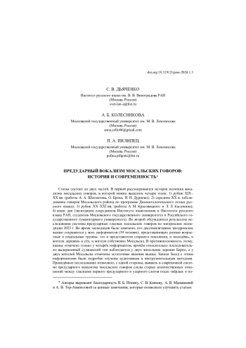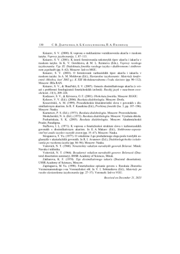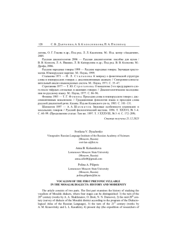16. Дьяченко 2015 - С. В. Дьяченко. Гласные первого предударного и ударного слогов в архаическом южнорусском говоре. Количественный анализ // Исследования по славянской диалектологии. Выпуск 17. М., 2015. С. 244-297. EDN: ZDEVVZ