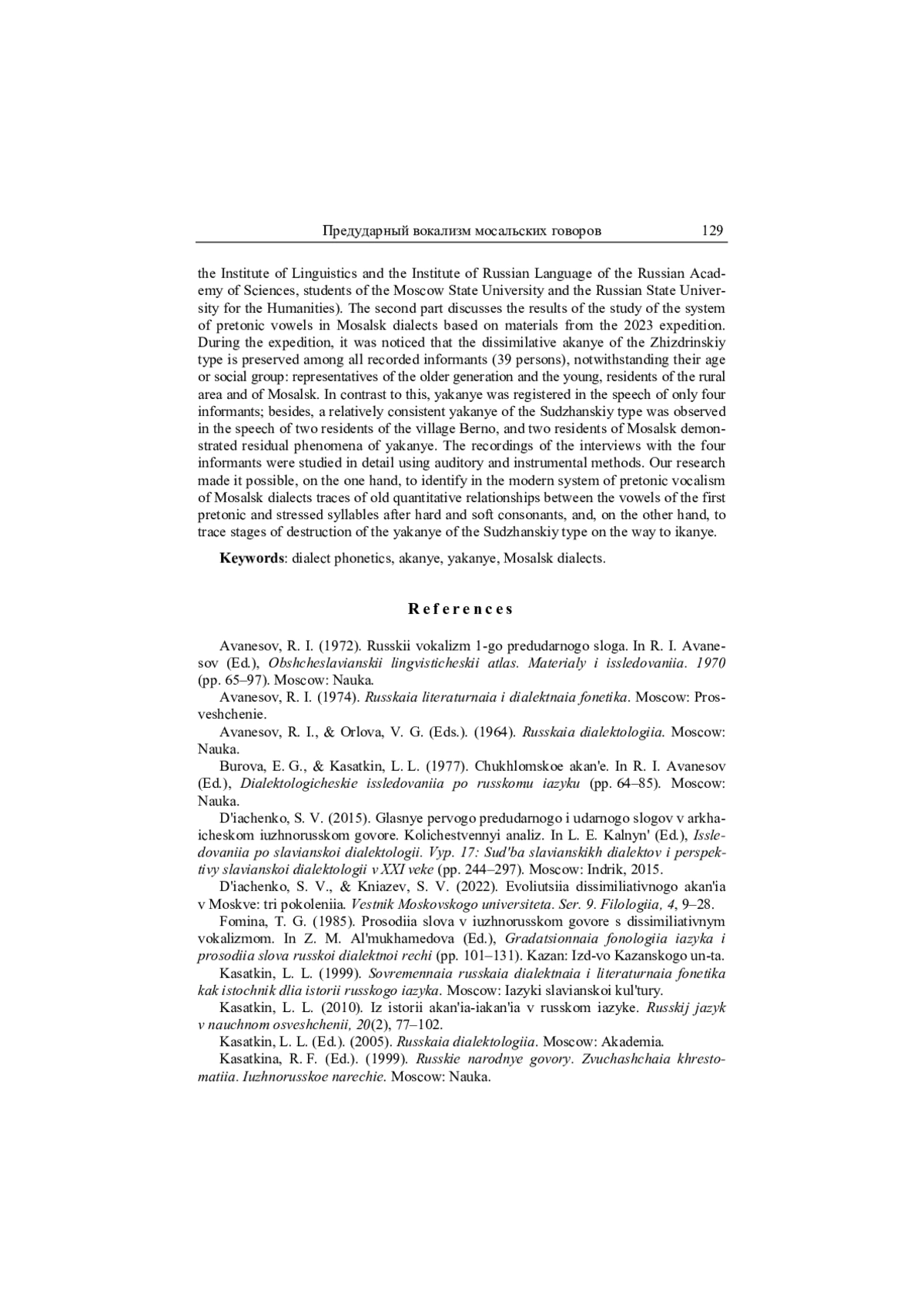 17. Дьяченко, Князев 2022 - С. В. Дьяченко, С. В. Князев. Эволюция диссимилятивного аканья в Москве: три поколения // Вестник Московского университета. Сер. 9. Филология. 2022. № 4. С. 9-28. EDN: NMFNDF