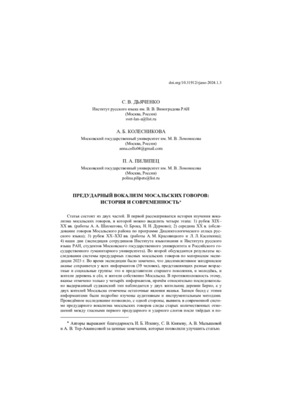 Статья состоит из двух частей. В первой рассматривается история изучения вокализма мосальских говоров, в которой можно выделить четыре этапа: 1) рубеж XIX– XX вв. (работы А. А. Шахматова, О. Брока, Н. Н. Дурново); 2) середина ХХ в. (обследование говоров Мосальского района по программе Диалектологического атласа русского языка); 3) рубеж XX–XXI вв. (работы А. М. Красовицкого и Л. Л. Касаткина); 4) наши дни (экспедиция сотрудников Института языкознания и Института русского языка РАН, студентов Московского государственного университета и Российского государственного гуманитарного университета). Во второй обсуждаются результаты исследования системы предударных гласных мосальских говоров по материалам экспедиции 2023 г. Во время экспедиции было замечено, что диссимилятивное жиздринское аканье сохраняется у всех информантов (39 человек), представляющих разные возрастные и социальные группы: это и представители старшего поколения, и молодёжь, и жители деревень и сёл, и жители собственно Мосальска. В противоположность этому, яканье отмечено только у четырёх информантов, причём относительно последовательно выдержанный суджанский тип наблюдается у двух жительниц деревни Берно, а у двух жителей Мосальска отмечены остаточные явления яканья. Записи бесед с этими информантами были подробно изучены аудитивным и инструментальным методами. Проведённое исследование позволило, с одной стороны, выявить в современной системе предударного вокализма мосальских говоров следы старых количественных отношений между гласными первого предударного и ударного слогов после твёрдых и после мягких согласных, с другой — проследить этапы разрушения яканья суджанского типа на пути к и́канью.