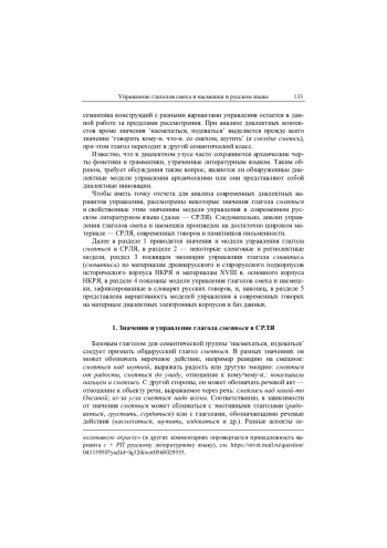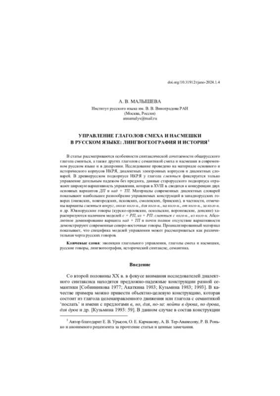 В статье рассматриваются особенности синтаксической сочетаемости общерусского глагола смеяться, а также других глаголов с семантикой смеха и насмешки в современном русском языке и в диахронии. Исследование проведено на материале основного и исторического корпусов НКРЯ, диалектных электронных корпусов и диалектных словарей. В древнерусском подкорпусе НКРЯ у глагола смеяться фиксируется только управление дательным падежом без предлога, данные старорусского подкорпуса отражают широкую вариативность управления, которая в XVIII в. сводится к конкуренции двух основных вариантов ДП и над + ТП. Материалы современных диалектных словарей показывают наибольшее разнообразие управляемых конструкций в западнорусских говорах (онежских, новгородских, псковских, смоленских, брянских), в частности, отмечены варианты смеяться вокруг, около кого-н., для кого-н., на кого-н., от кого-н., за кого-н. и др. Южнорусские говоры (курско-орловские, оскольские, воронежские, донские) характеризуются наличием моделей с + РП, из + РП: смеяться с кого-н., из кого-н. Абсолютное доминирование варианта над + ТП и почти полное отсутствие вариативности демонстрируют современные северо-восточные говоры. Проанализированный материал показывает, что специфика моделей управления может рассматриваться как различительная черта русских говоров