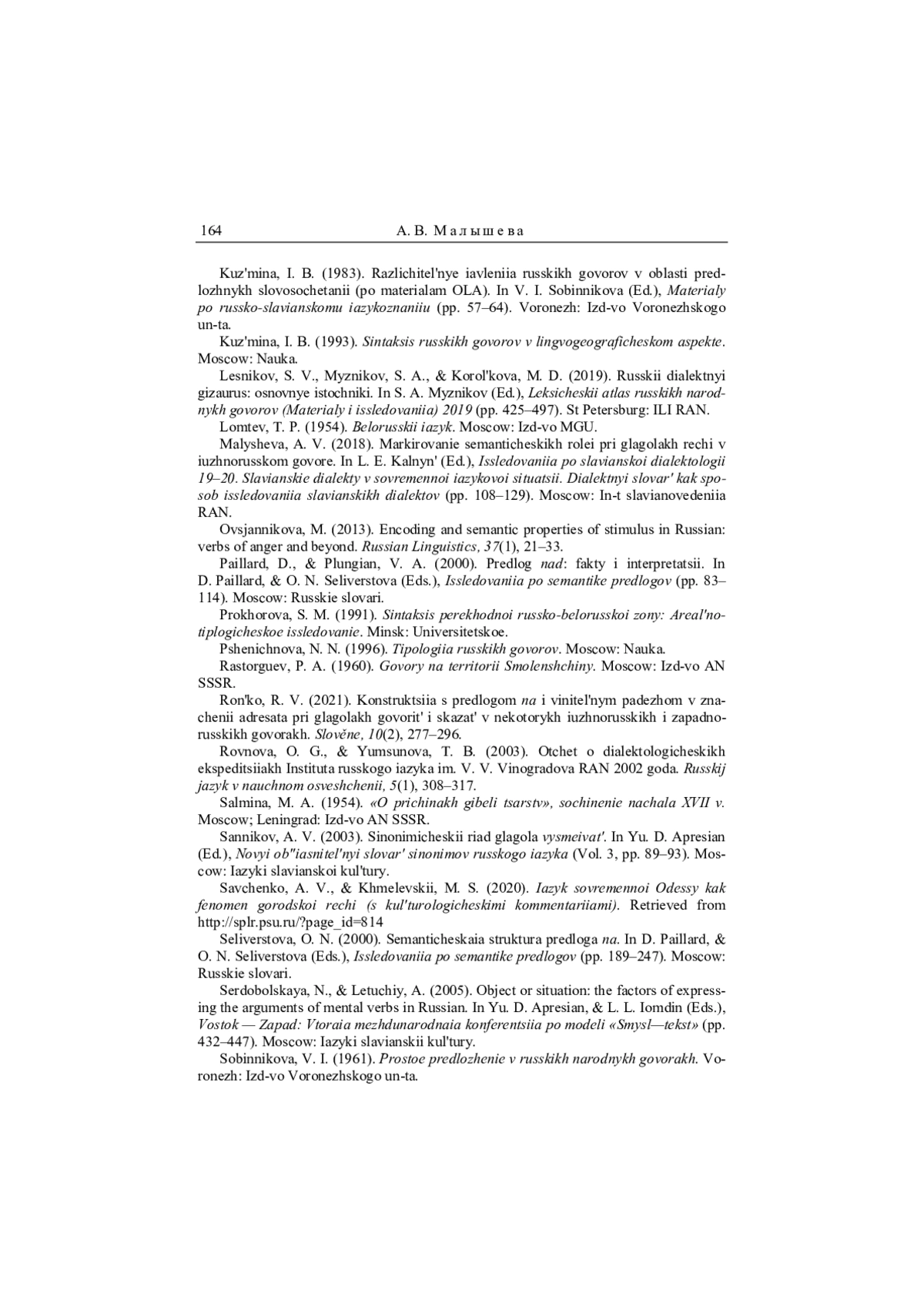 72. Малышева 2018 - А. В. Малышева. Маркирование семантических ролей при глаголах речи в южнорусском говоре // Исследования по славянской диалектологии 19-20. Славянские диалекты в современной языковой ситуации. Диалектный словарь как способ исследования славянских диалектов. М.: Ин-т славяноведения РАН, 2018. С. 108-129.