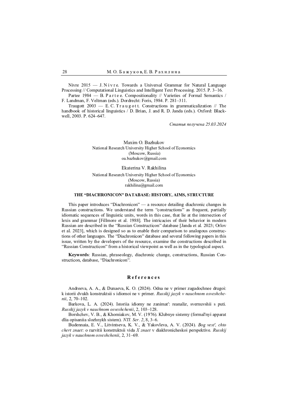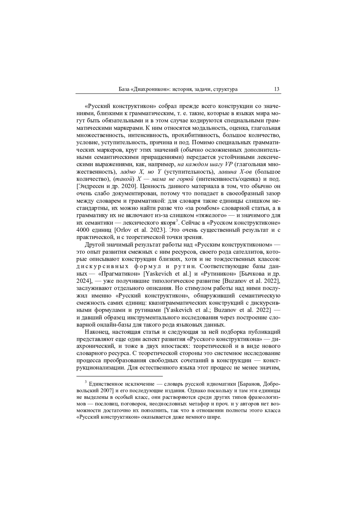 В статье представлен ресурс «Диахроникон», в котором содержится информация о диахронических изменениях русских конструкций. Под конструкциями нами понимаются частотные, частично идиоматизированные последовательности языковых единиц, в нашем случае слов на стыке лексики и грамматики [Fillmore et al. 1988]. То, как они ведут себя в современном русском языке, описано в специализированной лексической базе «Русский конструктикон» [Janda et al. 2023; Orlov et al. 2023], которая дает возможность сравнивать их с аналогичными конструкциями других языков. В базе данных «Диахроникон» и в последующих статьях этого выпуска журнала «Русский язык в научном освещении», написанных разработчиками ресурса, те же конструкции, которые попали в «Русский конструктикон», подробно рассмотрены в исторической перспективе, но также в типологическом ключе