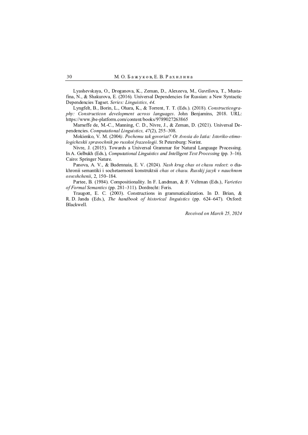 31. Janda et al. 2018 - L. A. Janda, O. Lyashevskaya, T. Nesset, E. Rakhilina, F. M. Tyers. Chapter 6. A constructicon for Russian: Filling in the gaps // Constructicography. Philadelphia, Amsterdam: John Benjamins, 2018. P. 165-182.