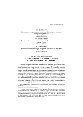 Данная работа представляет собой диахроническое корпусное исследование группы конструкций типа X весть / знает с разными вариантами якорей. Конструкции имеют долгую письменную историю, поэтому изучение особенностей процесса их конструкционализации представляет большое значение для теоретического осмысления идиоматизации. Вначале рассматривается история развития семантики и сочетаемости варианта с Бог, далее отдельно исследуется вариация с черт и в завершение — с обсценной и эвфемистичной лексикой. Результаты показывают, что диахроническое развитие вариантов с Бог и черт отличается незначительно, в то время как обсценные варианты демонстрируют большее разнообразие в плане синтаксиса и сочетаемости. В работе описаны значения такого рода конструкций (неопределенность, положительная и отрицательная оценка, интенсификация), а также время их фиксации в письменных источниках; семантические переходы были описаны нами в рамках теории конвенциональных импликатур ребрендингового типа и речевых импликатур.
