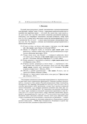 Русский язык располагает серией синонимичных идиоматизированных конструкций c якорем 1 вида X знает, с зависимым вопросительным местоимением или наречием (далее — wh-word): Бог знает что, черт знает куда, хрен знает кто и др. Все они имеют семантику негативной оценки неизвестного для говорящего компонента ситуации [Endresen, Janda 2020] (см. (1), (2)), а также могут выступать в качестве интенсификатора (3)–(5) и в контекстах без wh-word — в роли самостоятельных дискурсивных формул (см. (6), (7)), нередко с личным местоименным распространителем в винительном падеже