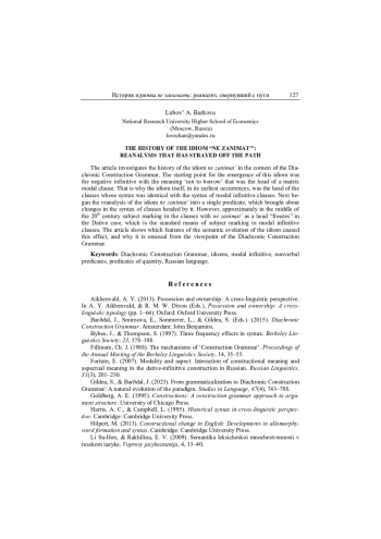 В статье рассматривается история идиомы не занимать в контексте диахронической грамматики конструкций. Источником возникновения этой идиомы был отрицательный инфинитив, выступавший вершиной модальной клаузы, являющейся главной в предложении. Поэтому сама идиома в самых ранних контекстах выступала вершиной клауз, чей синтаксис идентичен клаузам с модальным инфинитивом. Затем начал происходить реанализ идиомы не занимать в единый предикат, и под его действием изменился синтаксис клауз, вершина которых — эта идиома. Однако примерно в середине ХХ в. маркирование субъекта в клаузах с вершиной не занимать застывает в дативе, характерном для субъекта модальных инфинитивных клауз. В статье показано, с какими особенностями эволюции семантики идиомы не занимать связан этот эффект и чем он необычен с точки зрения диахронической грамматики конструкций