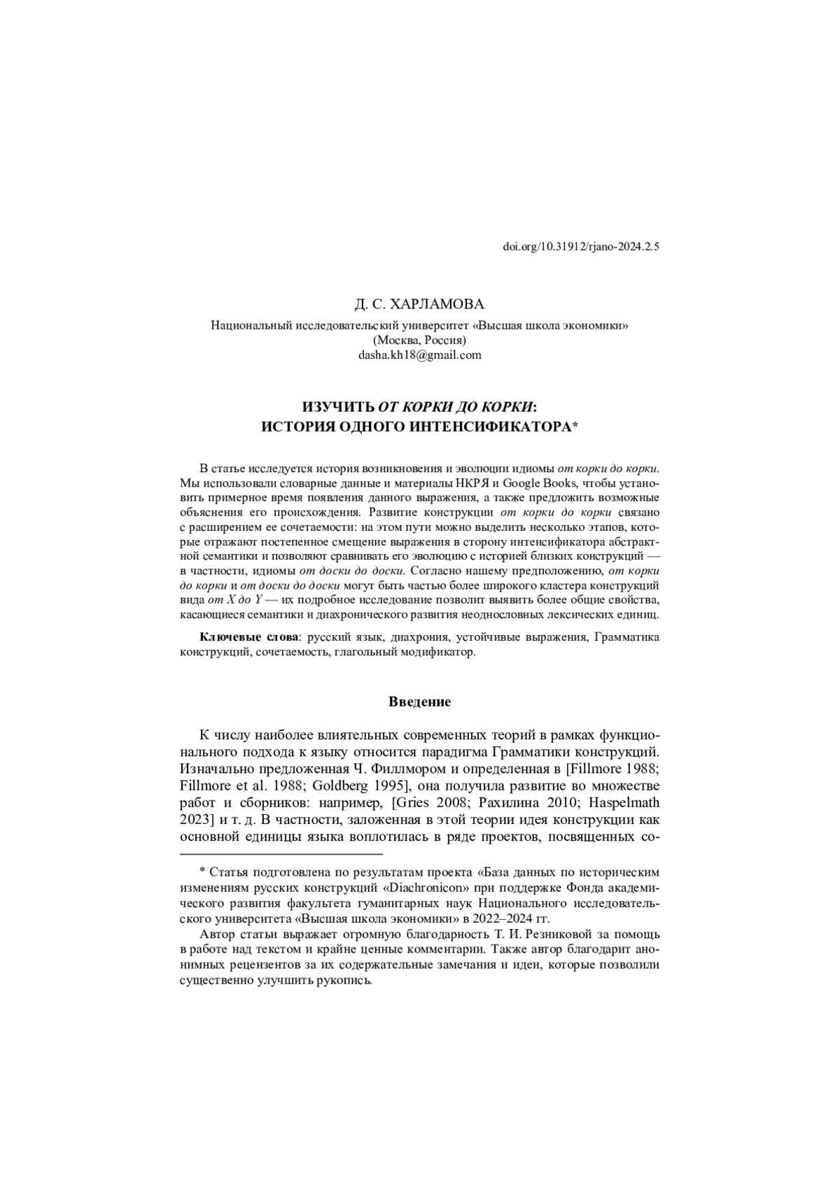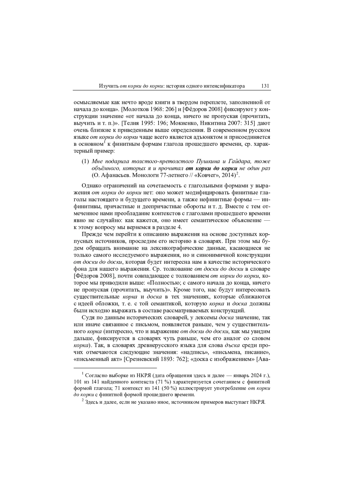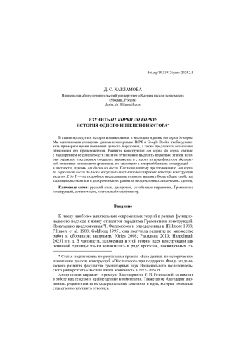 В статье исследуется история возникновения и эволюции идиомы от корки до корки. Мы использовали словарные данные и материалы НКРЯ и Google Books, чтобы установить примерное время появления данного выражения, а также предложить возможные объяснения его происхождения. Развитие конструкции от корки до корки связано с расширением ее сочетаемости: на этом пути можно выделить несколько этапов, которые отражают постепенное смещение выражения в сторону интенсификатора абстрактной семантики и позволяют сравнивать его эволюцию с историей близких конструкций — в частности, идиомы от доски до доски. Согласно нашему предположению, от корки до корки и от доски до доски могут быть частью более широкого кластера конструкций вида от X до Y — их подробное исследование позволит выявить более общие свойства, касающиеся семантики и диахронического развития неоднословных лексических единиц