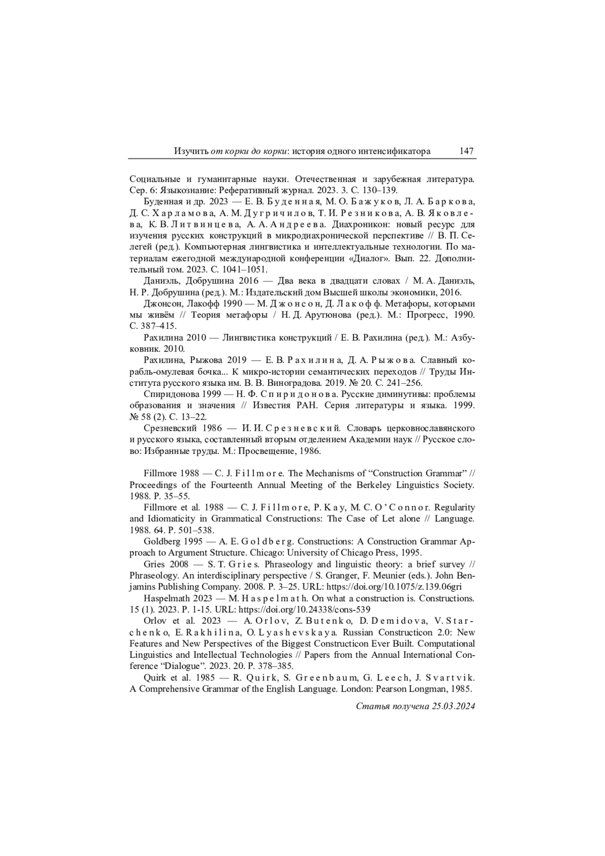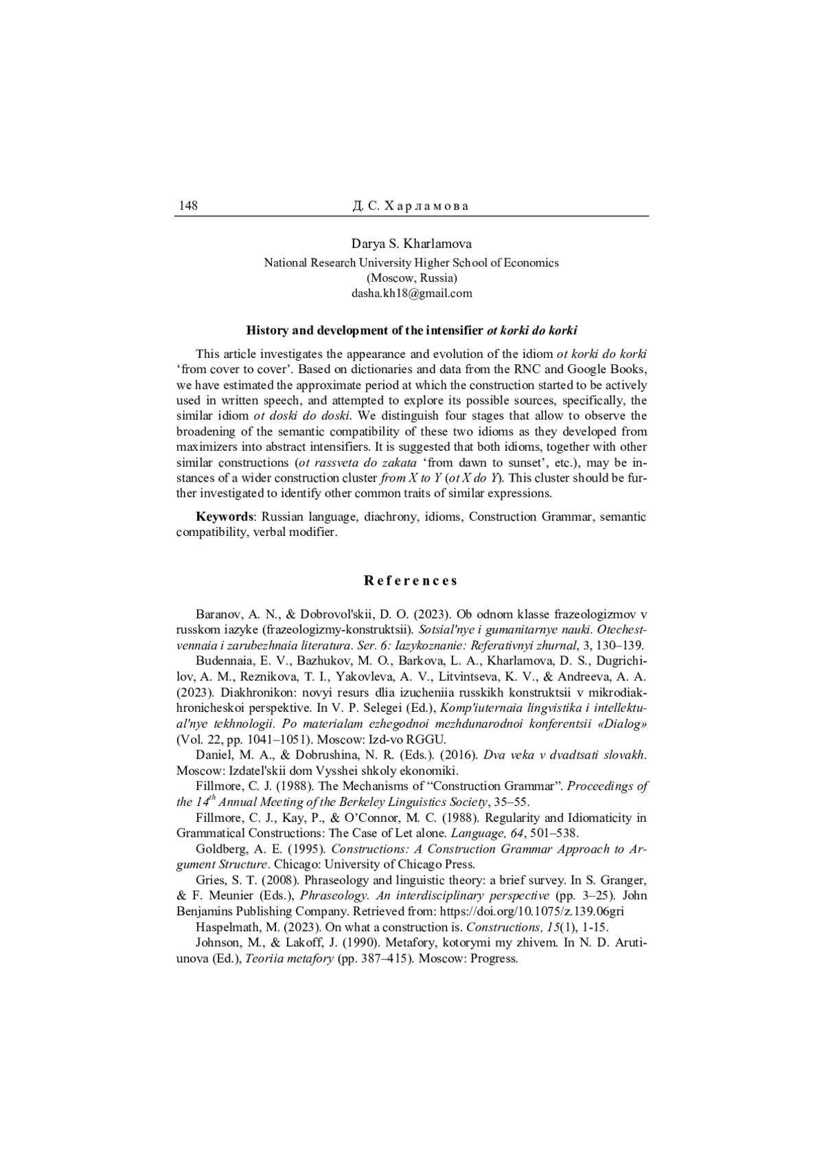 14. Баранов, Добровольский 2023 - А. Н. Баранов, Д. О. Добровольский. Об одном классе фразеологизмов в русском языке (фразеологизмы-конструкции) // Социальные и гуманитарные науки. Отечественная и зарубежная литература. Сер. 6: Языкознание: Реферативный журнал. 2023. 3. С. 130-139.