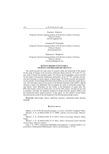 Исследование динамики функционирования фразеологической системы предполагает выделение временнóго периода, который достаточен для иллюстрации тенденций развития этой части лексики русского языка. По нашим представлениям, период с XIX по начало XXI в. репрезентативен для решения этой задачи. В настоящей статье основное внимание обращается на сбор данных по идиоматике языка XIX в. При этом делаются также некоторые предварительные выводы о тенденциях развития идиом для всего указанного временнóго периода