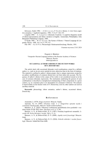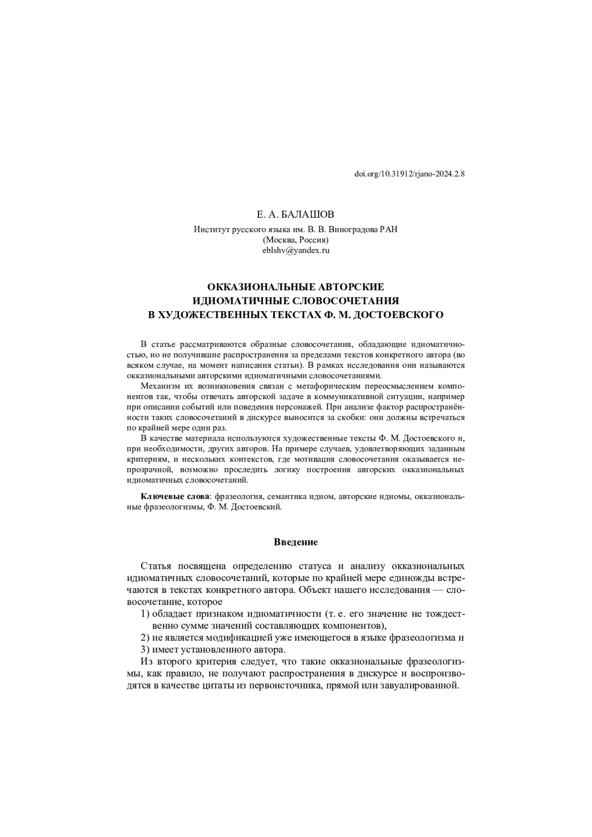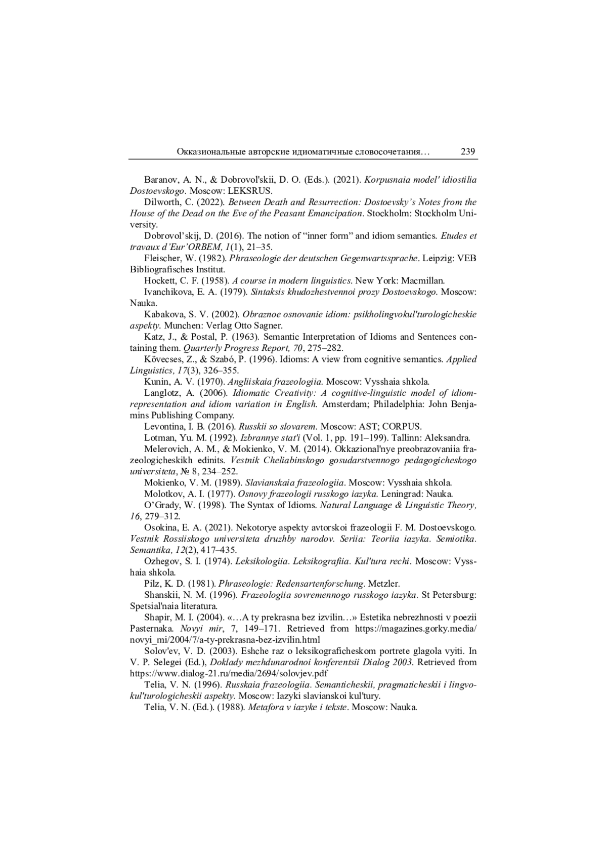 38. Осокина 2021 - Е. А. Осокина. Некоторые аспекты авторской фразеологии Ф. М. Достоевского // Вестник Российского университета дружбы народов. Серия: Теория языка. Семиотика. Семантика. 2021. Т. 12. № 2. С. 417-435. EDN: NEKNAF