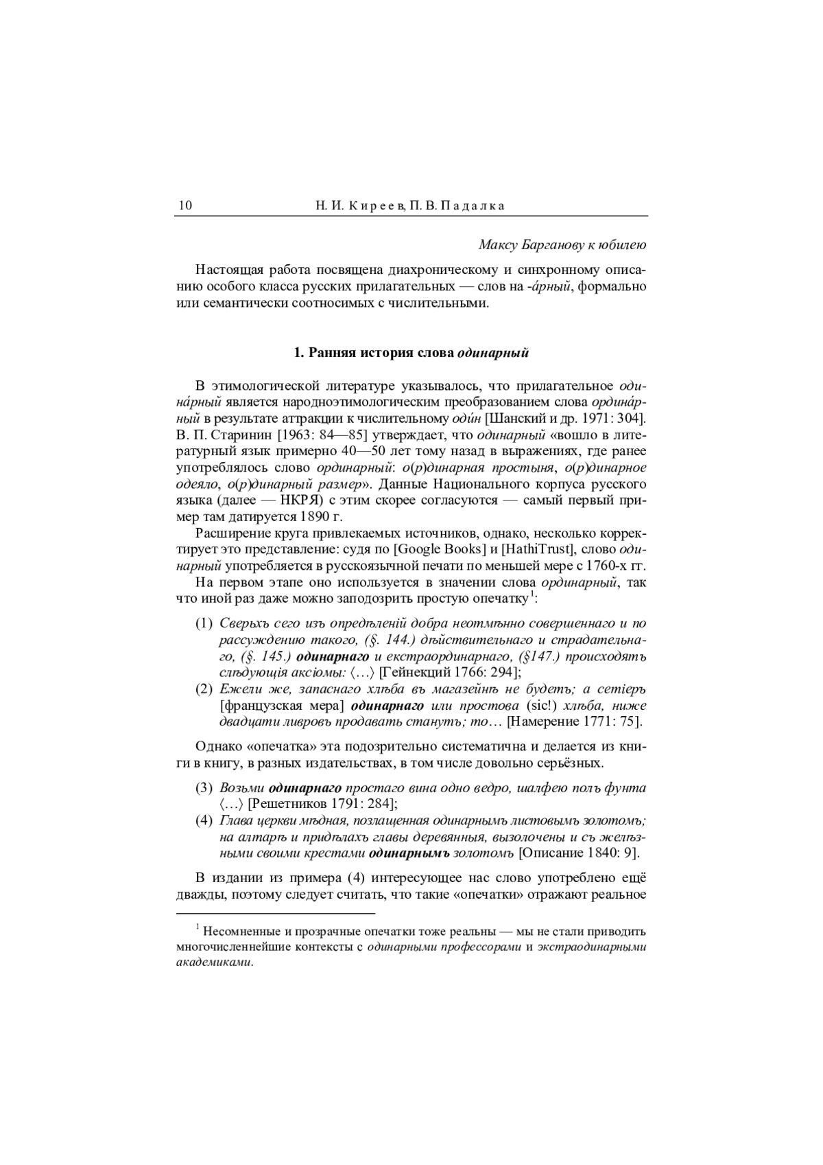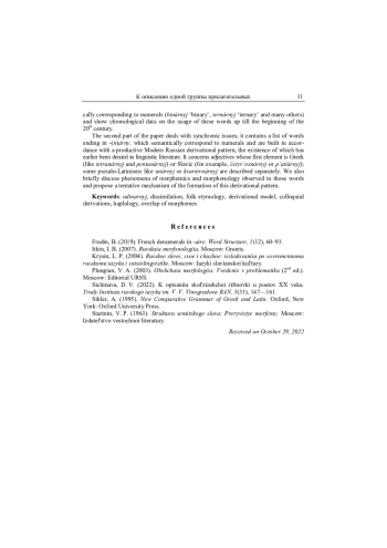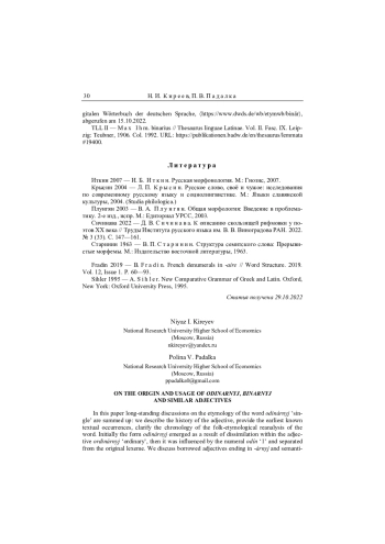 Данная статья пытается подвести итог многолетним дискуссиям о происхождении слова одинарный: описана история этого прилагательного, приведены самые ранние обнаруженные примеры, объяснена хронология его народноэтимологических преобразований. Изначально форма одинарный появляется в результате диссимиляции в слове ординарный, а затем, в результате аттракции к числительному один, семантически отделяется от исходной лексемы. Рассмотрены заимствованные прилагательные на -арный, соотносимые по смыслу с числительными (бинарный, тернарный и мн. др.), приведены хронологические данные об употреблении подобных слов до начала XX в., собраны сведения, помогающие установить стилистический статус этих прилагательных. Во второй части статьи, синхронической, приведен список не зафиксированных словарями прилагательных на -(н)арный, соотносимых с числительными и образованных по продуктивной в современном русском языке модели словообразования, существование которой ранее отрицалось в научной литературе. Речь о словах с начальной частью, восходящей к древнегреческому языку (типа тетранарный и пентанарный), и о словах с исконным первым элементом (типа четырёхнарный и пятиарный); отдельно рассмотрены псевдолатинизмы типа унарный или квартернарный. Описаны явления морфемики и морфонологии, наблюдаемые в данной группе прилагательных; предложен возможный механизм возникновения этой словообразовательной модели. Кроме того, рассмотрен ряд близких любопытных слов, не относящихся к ней напрямую