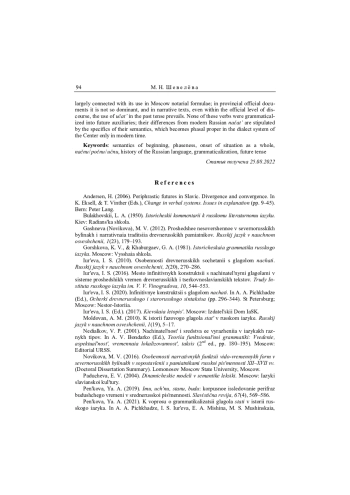16. Петрухин 2001 - П. В. Петрухин. Syntaxis verbi. Консекутивный имперфект в ранних восточнославянских летописях // Русский язык в научном освещении. 2001. № 1. С. 219-238. EDN: WCVSID