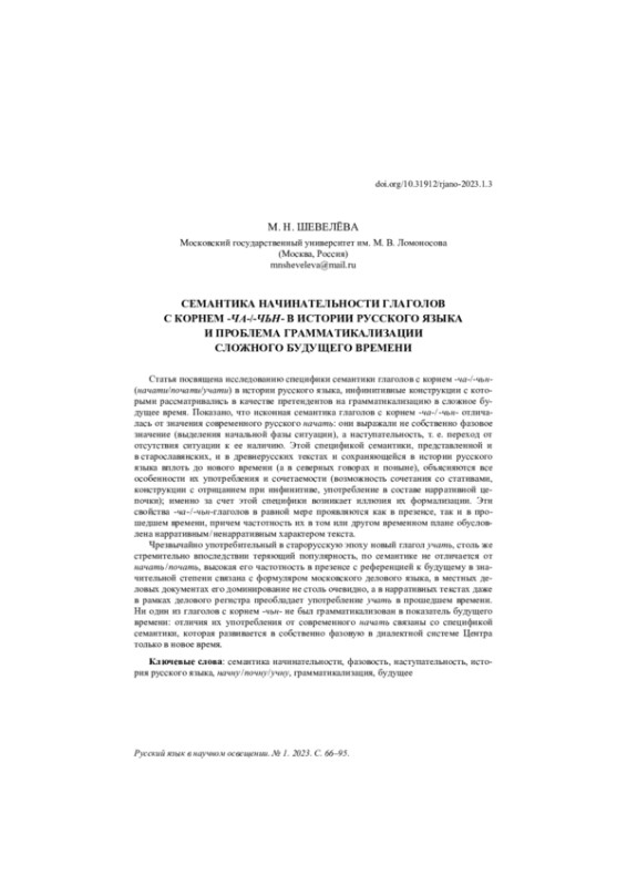 Статья посвящена исследованию специфики семантики глаголов с корнем -ча-/-чьн- (начати/почати/учати) в истории русского языка, инфинитивные конструкции с которыми рассматривались в качестве претендентов на грамматикализацию в сложное будущее время. Показано, что исконная семантика глаголов с корнем -ча- / -чьн- отличалась от значения современного русского начать: они выражали не собственно фазовое значение (выделения начальной фазы ситуации), а наступательность, т. е. переход от отсутствия ситуации к ее наличию. Этой спецификой семантики, представленной и в старославянских, и в древнерусских текстах и сохраняющейся в истории русского языка вплоть до нового времени (а в северных говорах и поныне), объясняются все особенности их употребления и сочетаемости (возможность сочетания со стативами, конструкции с отрицанием при инфинитиве, употребление в составе нарративной цепочки); именно за счет этой специфики возникает иллюзия их формализации. Эти свойства -ча- / -чьн-глаголов в равной мере проявляются как в презенсе, так и в прошедшем времени, причем частотность их в том или другом временном плане обусловлена нарративным / ненарративным характером текста. Чрезвычайно употребительный в старорусскую эпоху новый глагол учать, столь же стремительно впоследствии теряющий популярность, по семантике не отличается от начать / почать, высокая его частотность в презенсе c референцией к будущему в значительной степени связана с формуляром московского делового языка, в местных деловых документах его доминирование не столь очевидно, а в нарративных текстах даже в рамках делового регистра преобладает употребление учать в прошедшем времени. Ни один из глаголов с корнем -чьн- не был грамматикализован в показатель будущего времени: отличия их употребления от современного начать связаны со спецификой семантики, которая развивается в собственно фазовую в диалектной системе Центра только в новое время