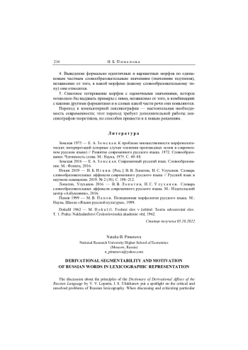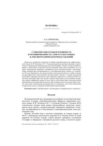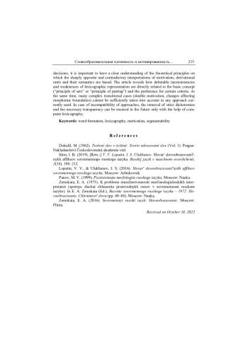 Фундаментальный труд выдающихся российских исследователей-дериватологов «Словарь словообразовательных аффиксов современного русского языка» В. В. Лопатина и И. С. Улуханова [Лопатин, Улуханов 2016] относительно недавно снова вызвал интереснейшую дискуссию, касающуюся среди прочего основополагающих принципов морфемного членения, мотивированности и объединения в словообразовательные типы производных слов