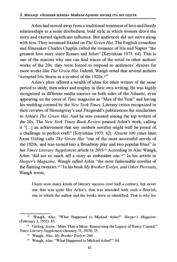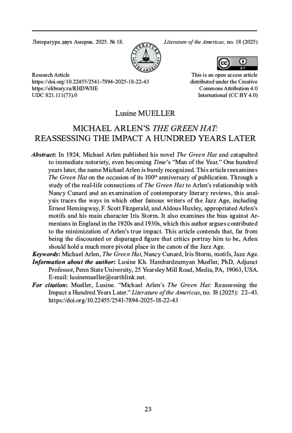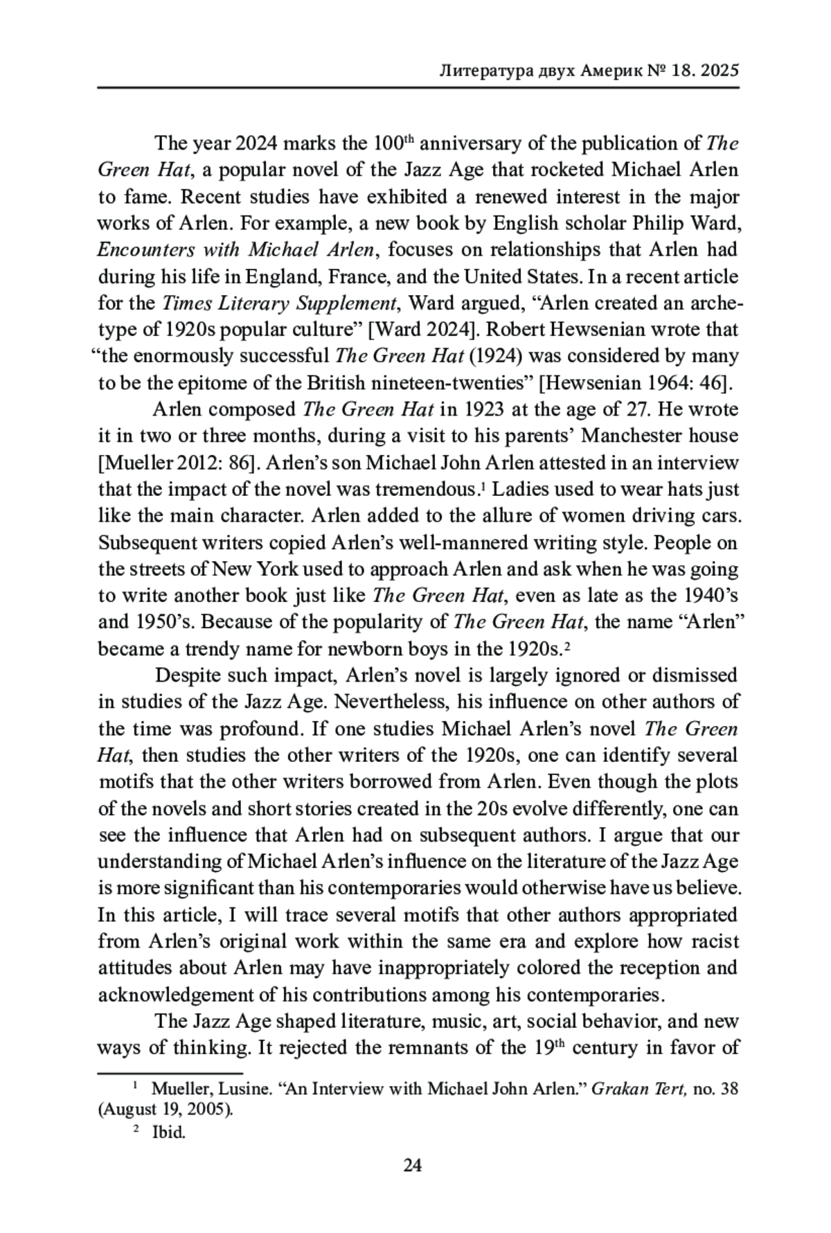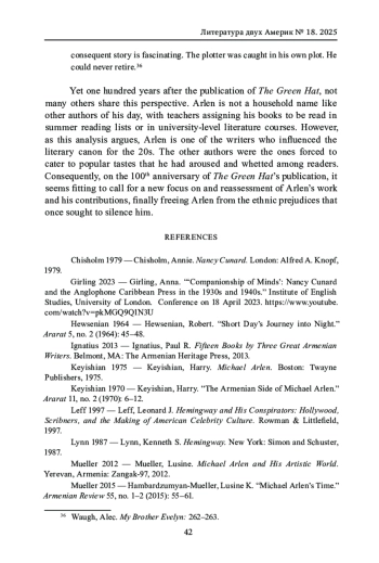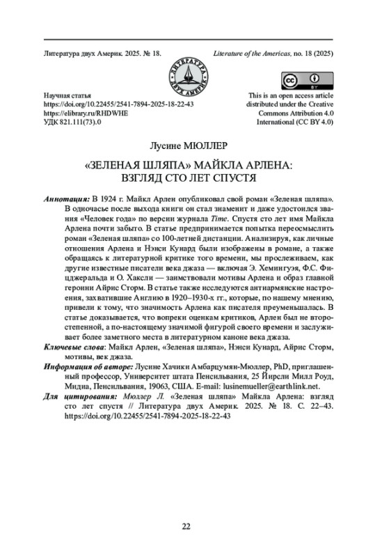 В 1924 г. Майкл Арлен опубликовал свой роман «Зеленая шляпа». В одночасье после выхода книги он стал знаменит и даже удостоился звания «Человек года» по версии журнала Time. Спустя сто лет имя Майкла Арлена почти забыто. В статье предпринимается попытка переосмыслить роман «Зеленая шляпа» со 100-летней дистанции. Анализируя, как личные отношения Арлена и Нэнси Кунард были изображены в романе, а также обращаясь к литературной критике того времени, мы прослеживаем, как другие известные писатели века джаза - включая Э. Хемингуэя, Ф. С. Фицджеральда и О. Хаксли - заимствовали мотивы Арлена и образ главной героини Айрис Сторм. В статье также исследуются антиармянские настроения, захватившие Англию в 1920-1930-х гг., которые, по нашему мнению, привели к тому, что значимость Арлена как писателя преуменьшалась. В статье доказывается, что вопреки оценкам критиков, Арлен был не второстепенной, а по-настоящему значимой фигурой своего времени и заслуживает более заметного места в литературном каноне века джаза.