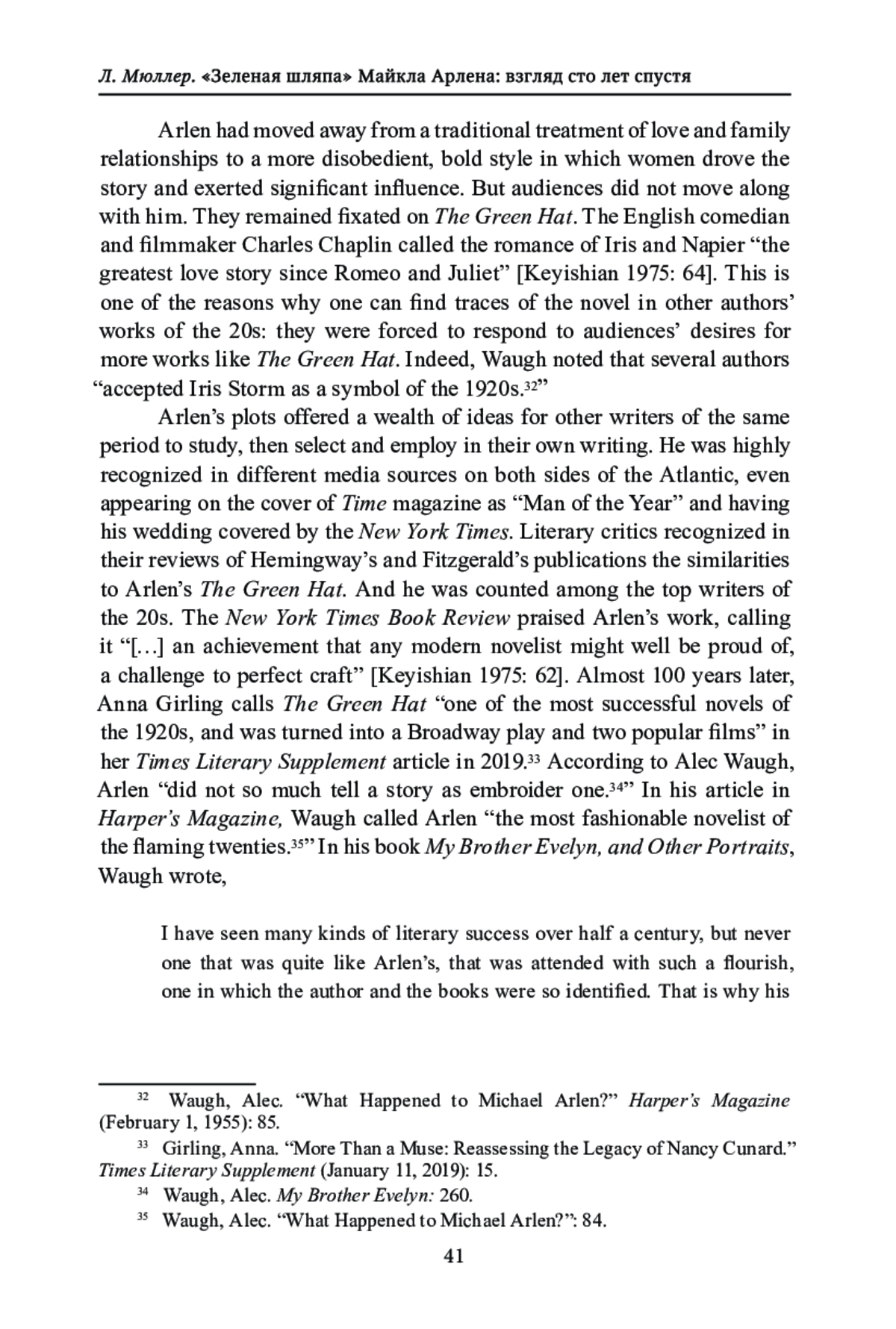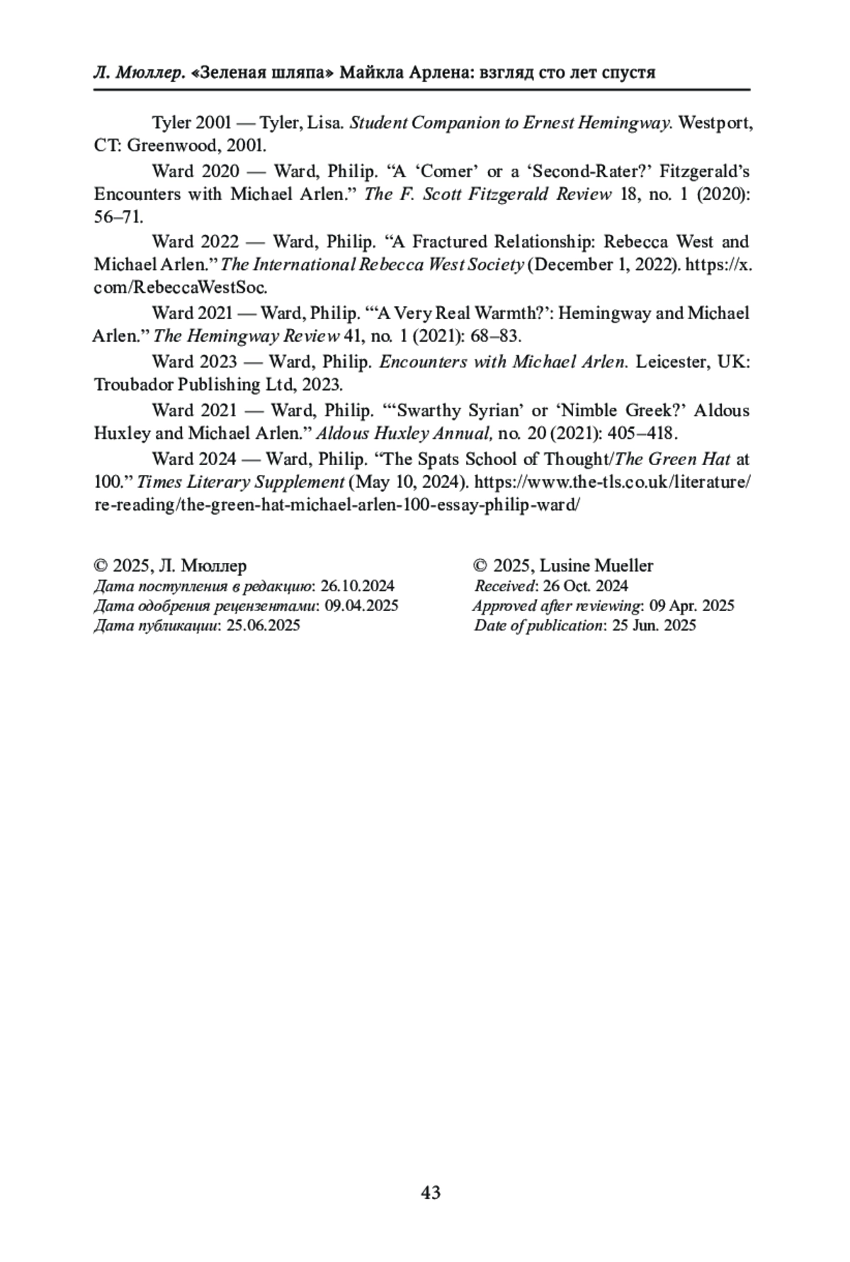 17. Ward, Philip. “The Spats School of Thought/The Green Hat at 100”. Times Literary Supplement (May 10, 2024). https://www.the-tls.co.uk/literature/re-reading/the-green-hat-michael-arlen-100-essay-philip-ward.