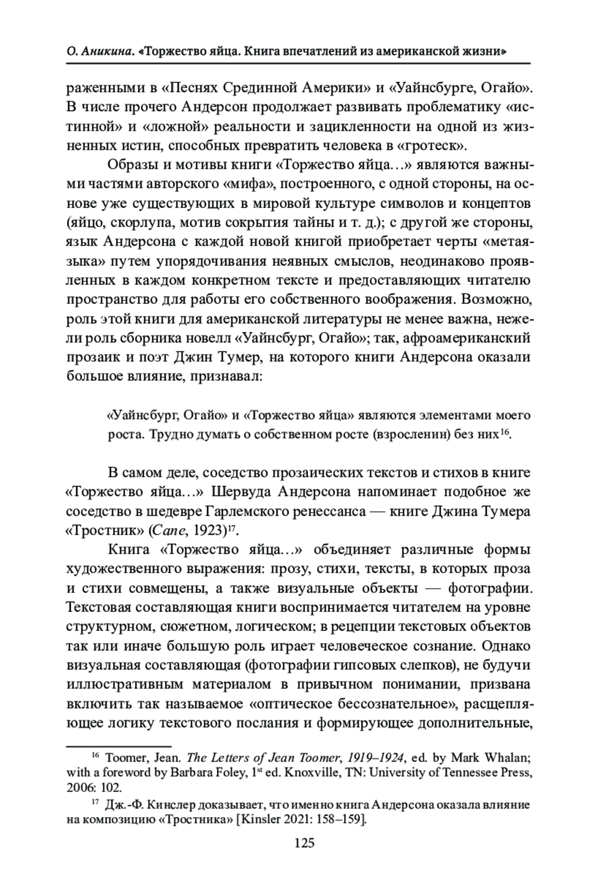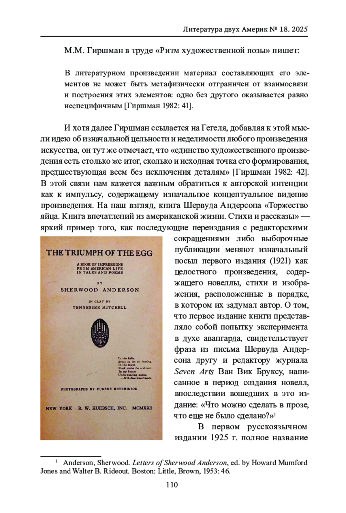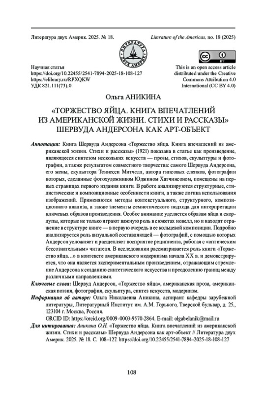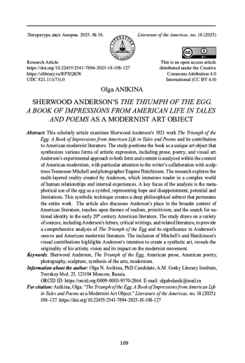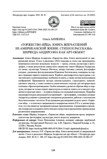 Книга Шервуда Андерсона «Торжество яйца. Книга впечатлений из американской жизни. Стихи и рассказы» (1921) показана в статье как произведение, являющееся синтезом нескольких искусств - прозы, стихов, скульптуры и фотографии, а также результатом совместного творчества: самого Шервуда Андерсона, его жены, скульптора Теннесси Митчелл, автора гипсовых слепков, фотографии которых, сделанные фотохудожником Юджином Хатчинсоном, помещены на первых страницах первого издания книги. В работе анализируются структурные, стилистические и композиционные особенности книги, а также логика использования изображений. Применяются методы контекстуального, структурного, композиционного анализа, а также элементы семиотического подхода для интерпретации ключевых образов произведения. Особое внимание уделяется образам яйца и скорлупы, которые не только играют важную роль в сюжетах новелл, но и находят отражение в структуре книге - в первую очередь в ее кольцевой композиции. Подробно анализируется роль визуальной составляющей - фотографий, с помощью которых Андерсон усложняет и расщепляет восприятие реципиента, работая с «оптическим бессознательным» читателя. В исследовании рассматривается роль книги «Торжество яйца…» в контексте американского модернизма начала XX в. и демонстрируется, что она является экспериментальным произведением, отражающим стремление Андерсона к созданию синтетического искусства и преодолению границ между различными направлениями.