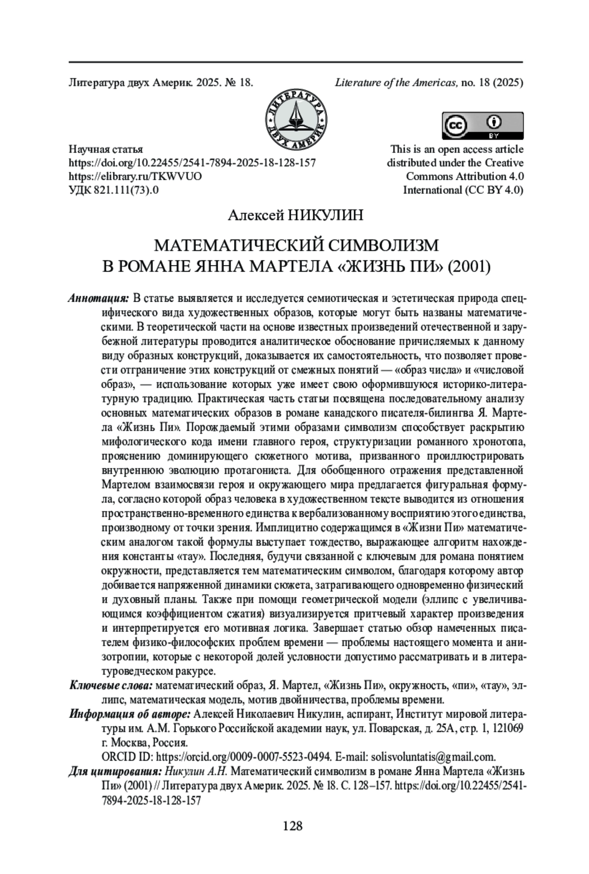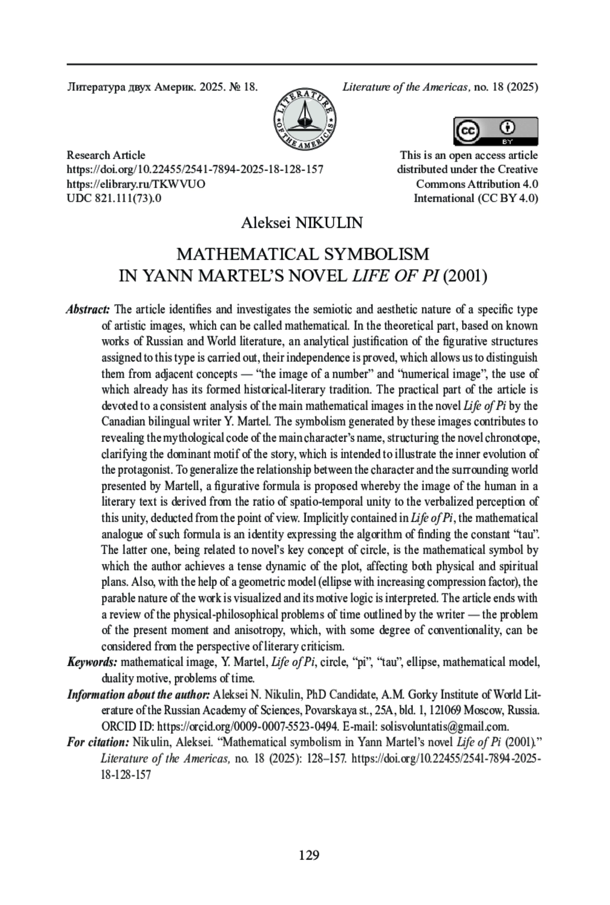 В статье выявляется и исследуется семиотическая и эстетическая природа специфического вида художественных образов, которые могут быть названы математическими. В теоретической части на основе известных произведений отечественной и зарубежной литературы проводится аналитическое обоснование причисляемых к данному виду образных конструкций, доказывается их самостоятельность, что позволяет провести отграничение этих конструкций от смежных понятий - «образ числа» и «числовой образ», - использование которых уже имеет свою оформившуюся историко-литературную традицию. Практическая часть статьи посвящена последовательному анализу основных математических образов в романе канадского писателя-билингва Я. Мартела «Жизнь Пи». Порождаемый этими образами символизм способствует раскрытию мифологического кода имени главного героя, структуризации романного хронотопа, прояснению доминирующего сюжетного мотива, призванного проиллюстрировать внутреннюю эволюцию протагониста. Для обобщенного отражения представленной Мартелом взаимосвязи героя и окружающего мира предлагается фигуральная формула, согласно которой образ человека в художественном тексте выводится из отношения пространственно-временного единства к вербализованному восприятию этого единства, производному от точки зрения. Имплицитно содержащимся в «Жизни Пи» математическим аналогом такой формулы выступает тождество, выражающее алгоритм нахождения константы «тау». Последняя, будучи связанной с ключевым для романа понятием окружности, представляется тем математическим символом, благодаря которому автор добивается напряженной динамики сюжета, затрагивающего одновременно физический и духовный планы. Также при помощи геометрической модели (эллипс с увеличивающимся коэффициентом сжатия) визуализируется притчевый характер произведения и интерпретируется его мотивная логика. Завершает статью обзор намеченных писателем физико-философских проблем времени - проблемы настоящего момента и анизотропии, которые с некоторой долей условности допустимо рассматривать и в литературоведческом ракурсе.