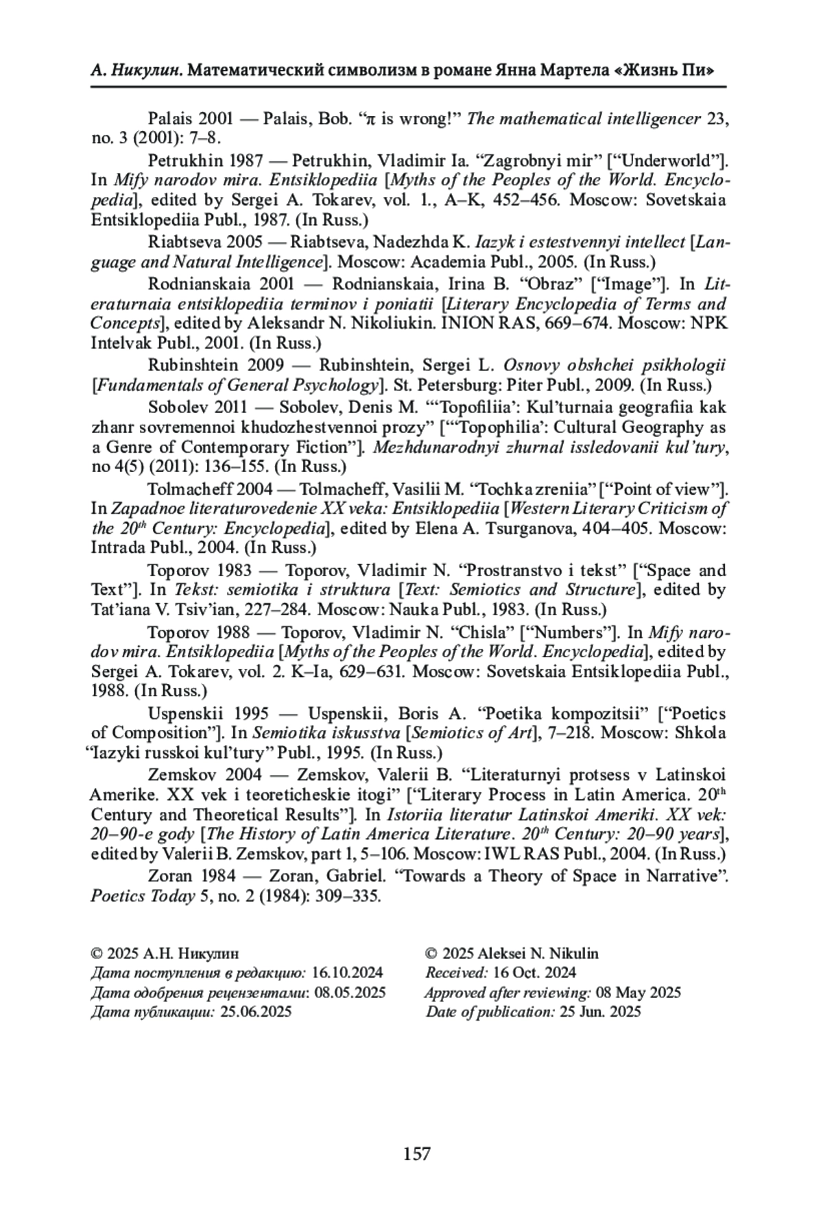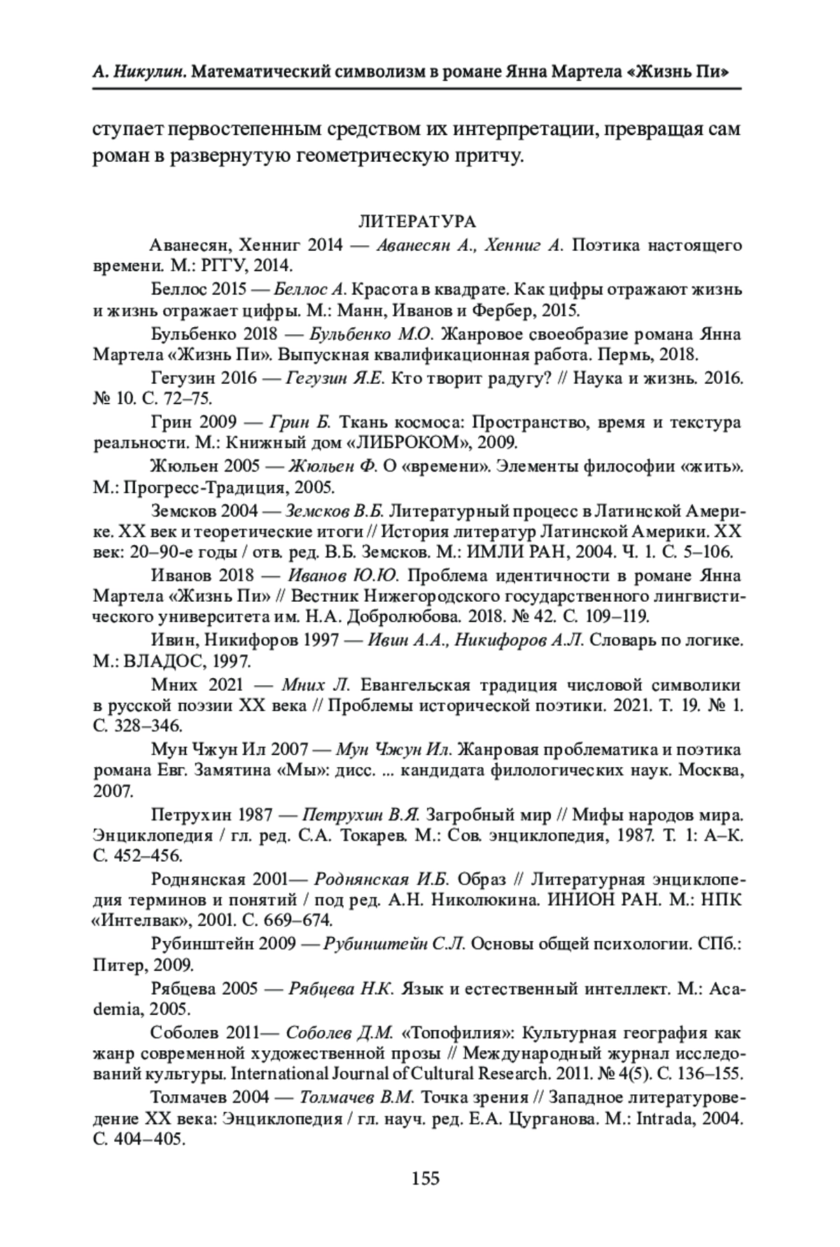3. Бульбенко М.О. Жанровое своеобразие романа Янна Мартела “Жизнь Пи”. Выпускная квалификационная работа. Пермь, 2018.