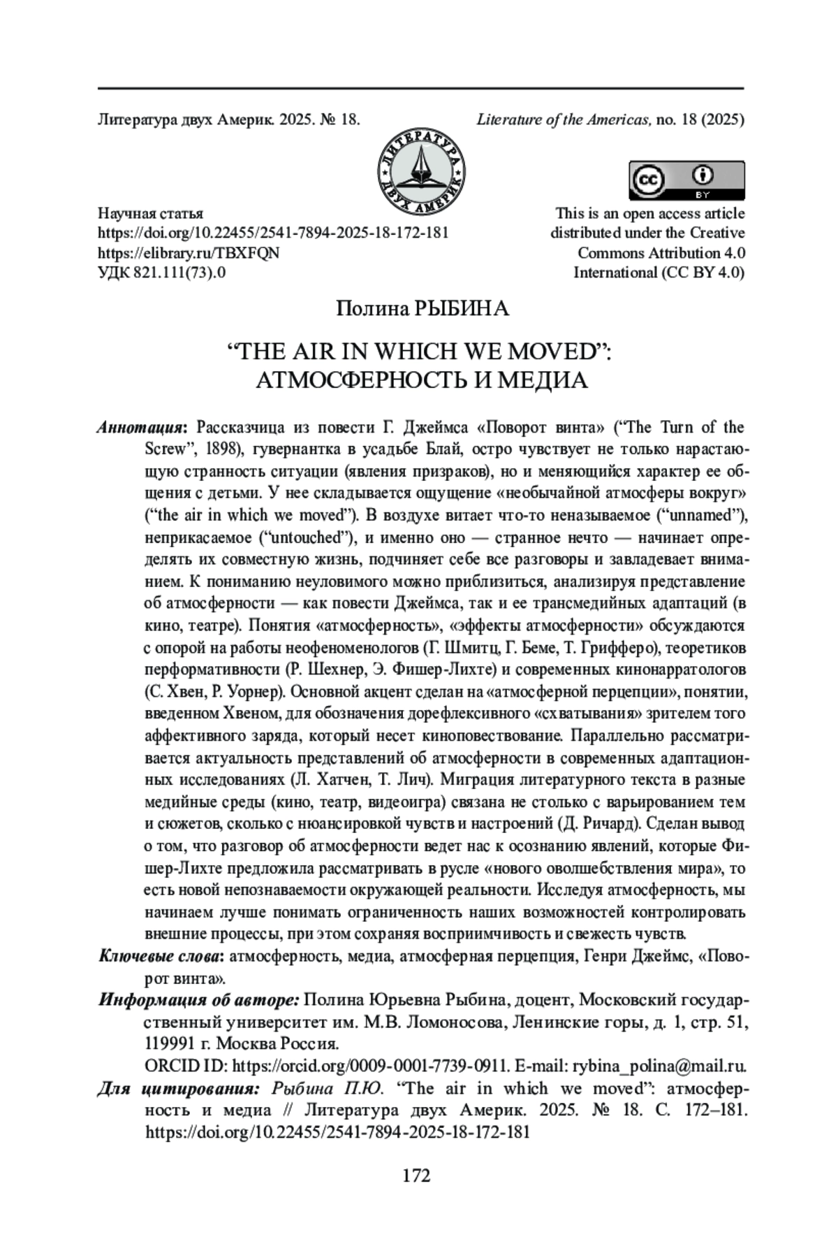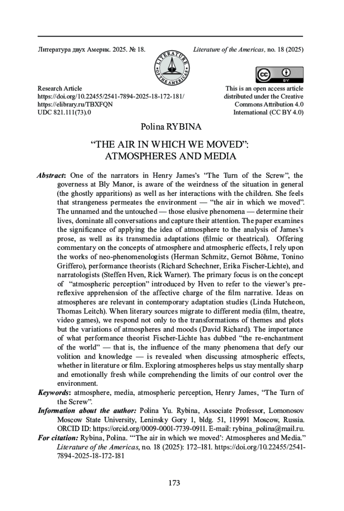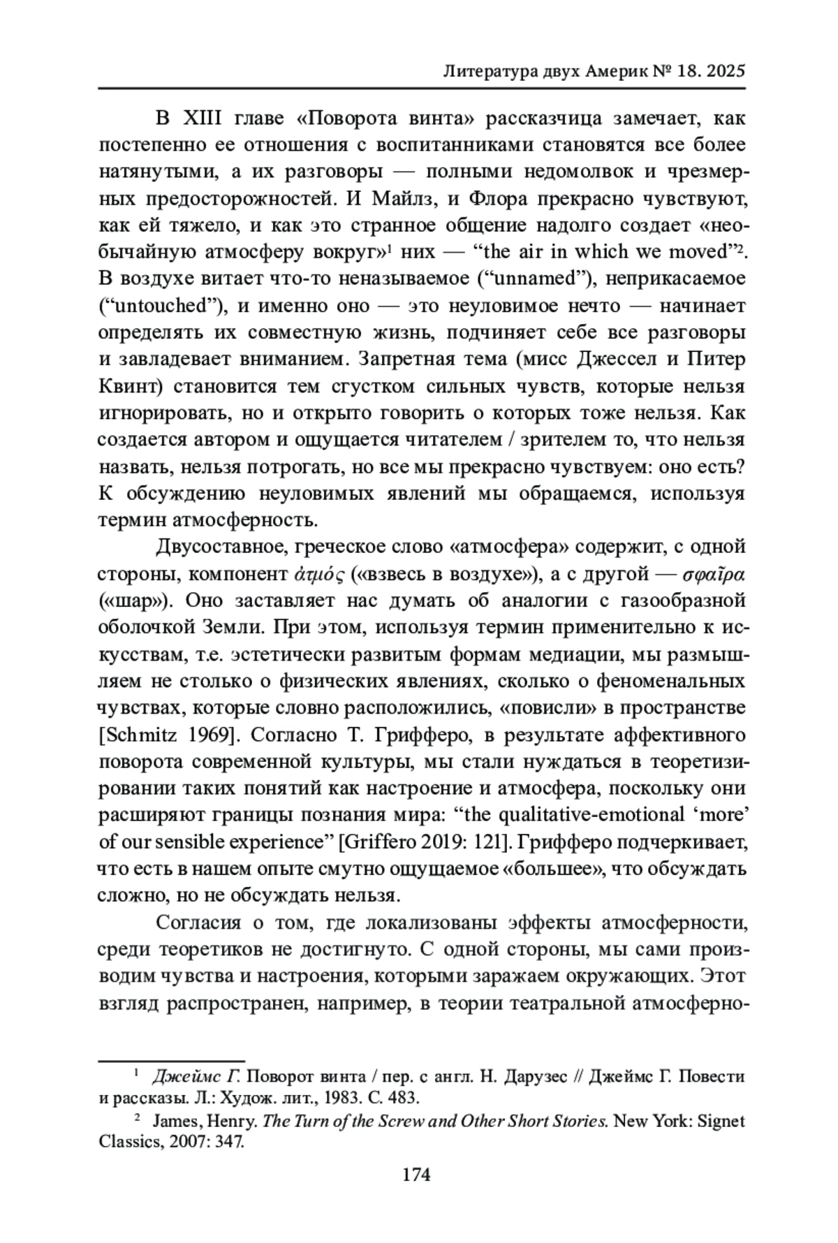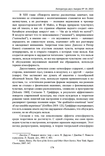 Рассказчица из повести Г. Джеймса «Поворот винта» (“The Turn of the Screw”, 1898), гувернантка в усадьбе Блай, остро чувствует не только нарастающую странность ситуации (явления призраков), но и меняющийся характер ее общения с детьми. У нее складывается ощущение «необычайной атмосферы вокруг» (“the air in which we moved”). В воздухе витает что-то неназываемое (“unnamed”), неприкасаемое (“untouched”), и именно оно - странное нечто - начинает определять их совместную жизнь, подчиняет себе все разговоры и завладевает вниманием. К пониманию неуловимого можно приблизиться, анализируя представление об атмосферности - как повести Джеймса, так и ее трансмедийных адаптаций (в кино, театре). Понятия «атмосферность», «эффекты атмосферности» обсуждаются с опорой на работы неофеноменологов (Г. Шмитц, Г. Беме, Т. Грифферо), теоретиков перформативности (Р. Шехнер, Э. Фишер-Лихте) и современных кинонарратологов (С. Хвен, Р. Уорнер). Основной акцент сделан на «атмосферной перцепции», понятии, введенном Хвеном, для обозначения дорефлексивного «схватывания» зрителем того аффективного заряда, который несет киноповествование. Параллельно рассматривается актуальность представлений об атмосферности в современных адаптационных исследованиях (Л. Хатчен, Т. Лич). Миграция литературного текста в разные медийные среды (кино, театр, видеоигра) связана не столько с варьированием тем и сюжетов, сколько с нюансировкой чувств и настроений (Д. Ричард). Сделан вывод о том, что разговор об атмосферности ведет нас к осознанию явлений, которые Фишер-Лихте предложила рассматривать в русле «нового оволшебствления мира», то есть новой непознаваемости окружающей реальности. Исследуя атмосферность, мы начинаем лучше понимать ограниченность наших возможностей контролировать внешние процессы, при этом сохраняя восприимчивость и свежесть чувств.