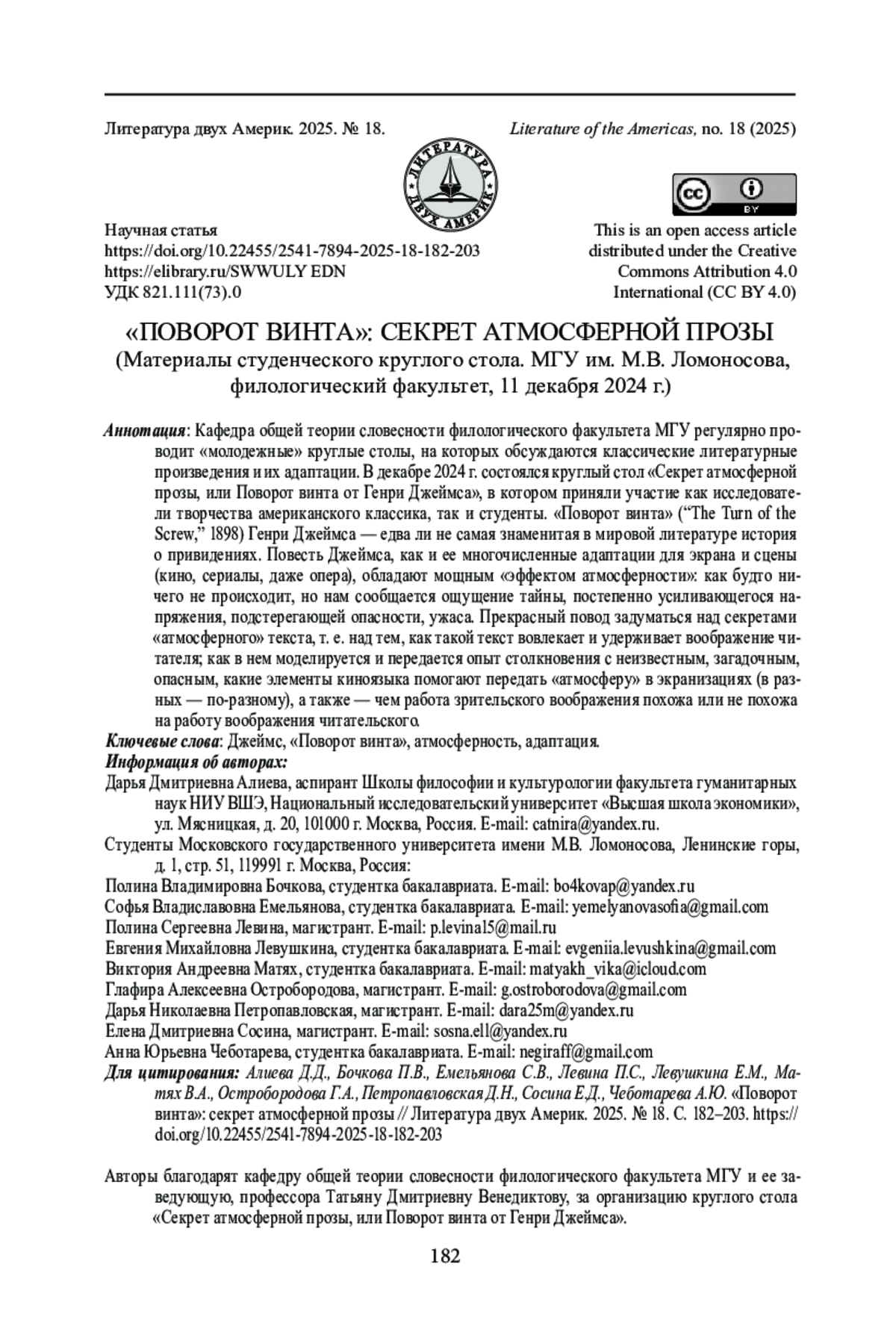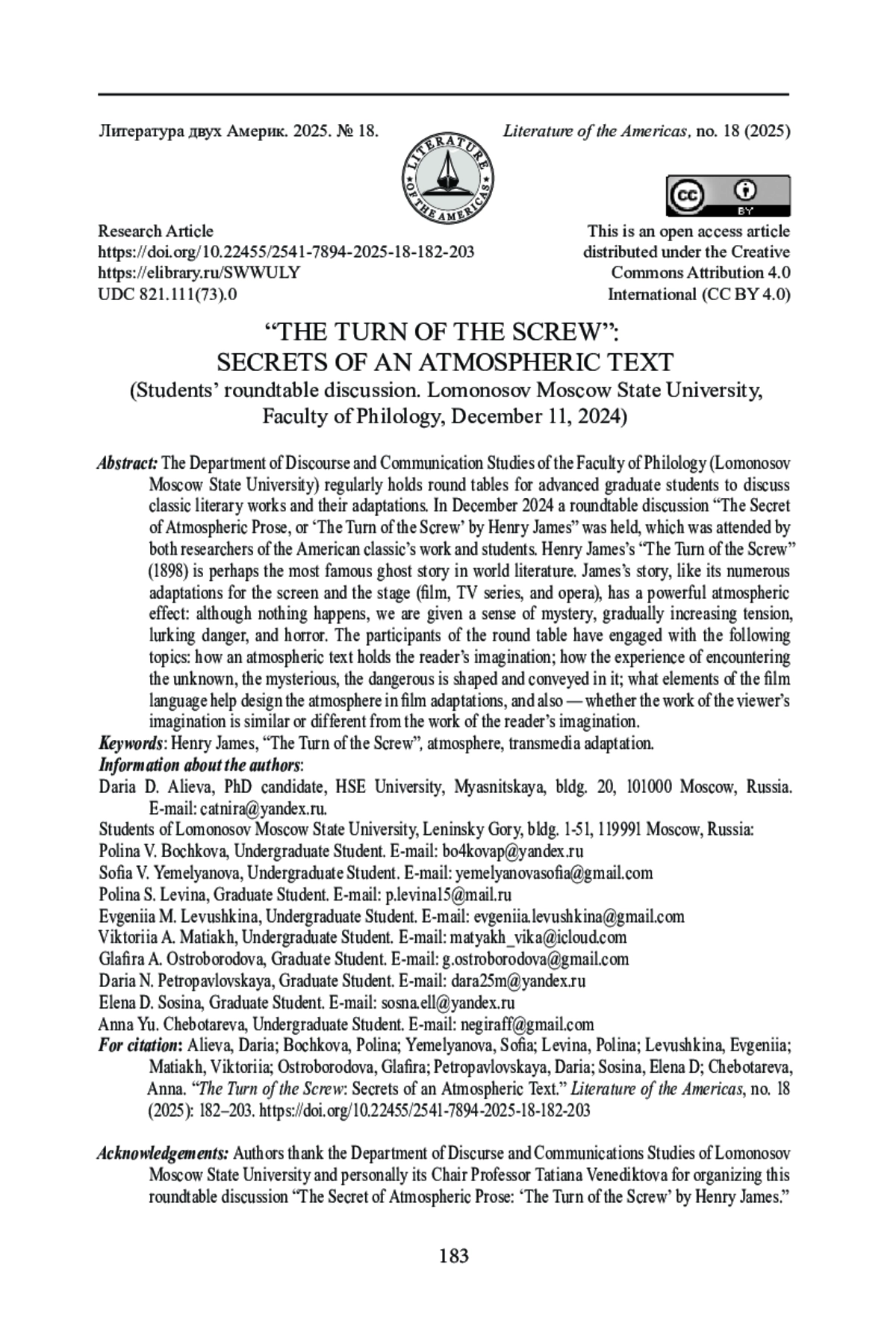 Кафедра общей теории словесности филологического факультета МГУ регулярно проводит «молодежные» круглые столы, на которых обсуждаются классические литературные произведения и их адаптации. В декабре 2024 г. состоялся круглый стол «Секрет атмосферной прозы, или Поворот винта от Генри Джеймса», в котором приняли участие как исследователи творчества американского классика, так и студенты. «Поворот винта» (“The Turn of the Screw,” 1898) Генри Джеймса - едва ли не самая знаменитая в мировой литературе история о привидениях. Повесть Джеймса, как и ее многочисленные адаптации для экрана и сцены (кино, сериалы, даже опера), обладают мощным «эффектом атмосферности»: как будто ничего не происходит, но нам сообщается ощущение тайны, постепенно усиливающегося напряжения, подстерегающей опасности, ужаса. Прекрасный повод задуматься над секретами «атмосферного» текста, т. е. над тем, как такой текст вовлекает и удерживает воображение читателя; как в нем моделируется и передается опыт столкновения с неизвестным, загадочным, опасным, какие элементы киноязыка помогают передать «атмосферу» в экранизациях (в разных - по-разному), а также - чем работа зрительского воображения похожа или не похожа на работу воображения читательского.