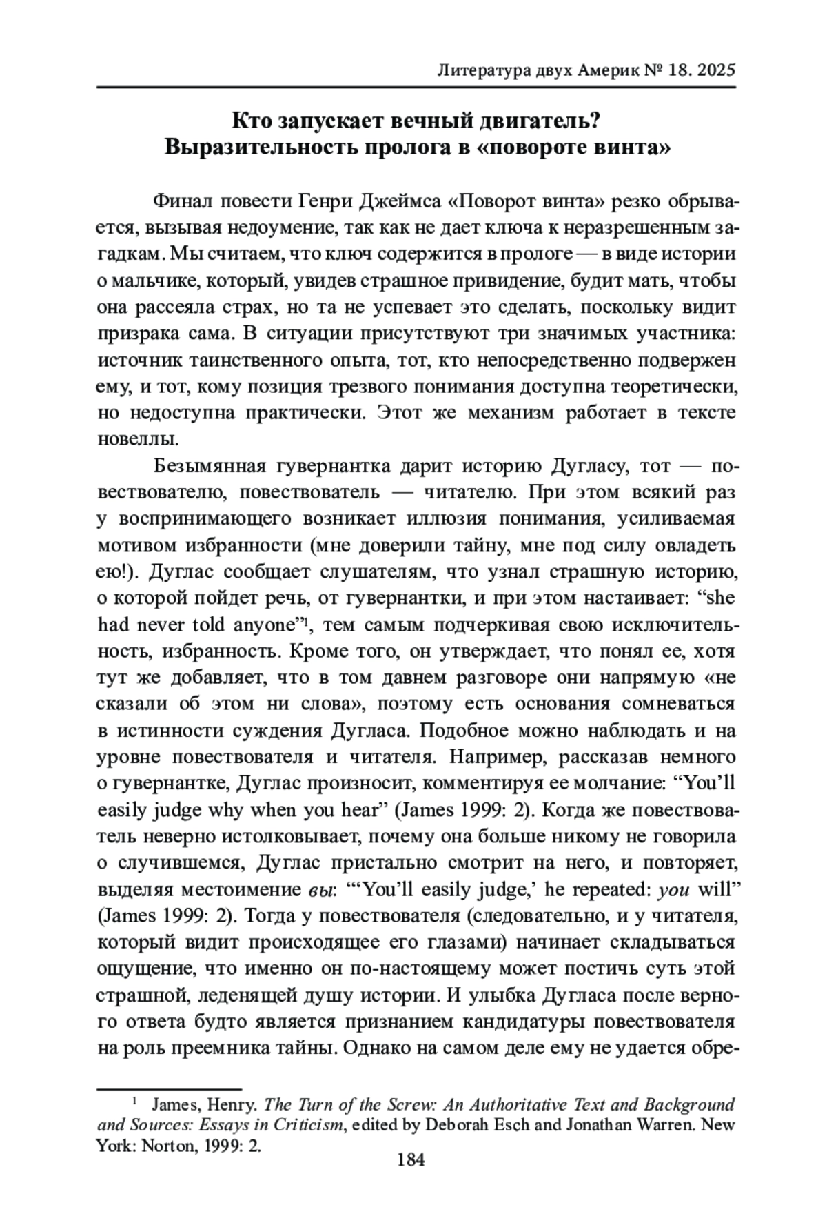 Финал повести Генри Джеймса «Поворот винта» резко обрывается, вызывая недоумение, так как не дает ключа к неразрешенным загадкам. Мы считаем, что ключ содержится в прологе — в виде истории о мальчике, который, увидев страшное привидение, будит мать, чтобы она рассеяла страх, но та не успевает это сделать, поскольку видит призрака сама. В ситуации присутствуют три значимых участника: источник таинственного опыта, тот, кто непосредственно подвержен ему, и тот, кому позиция трезвого понимания доступна теоретически, но недоступна практически. Этот же механизм работает в тексте новеллы.