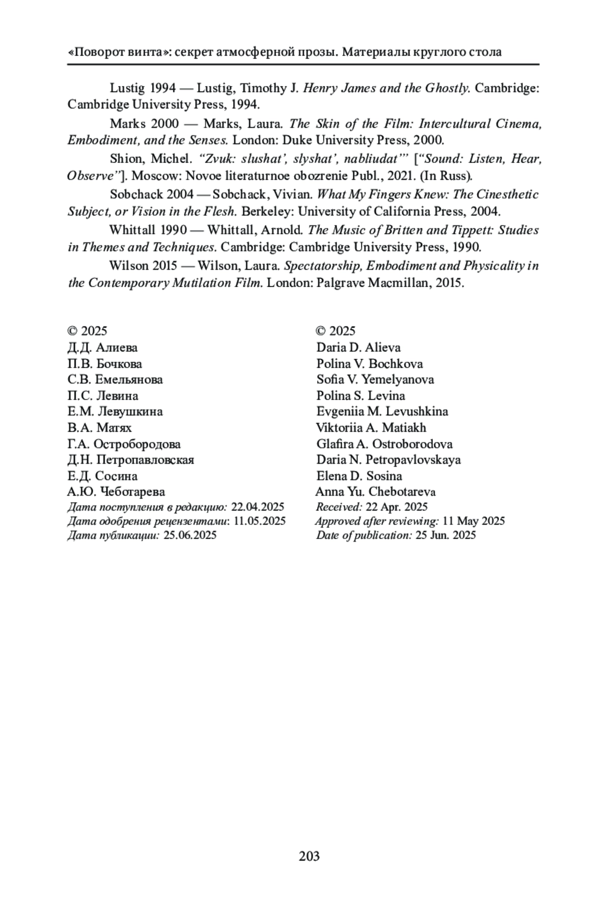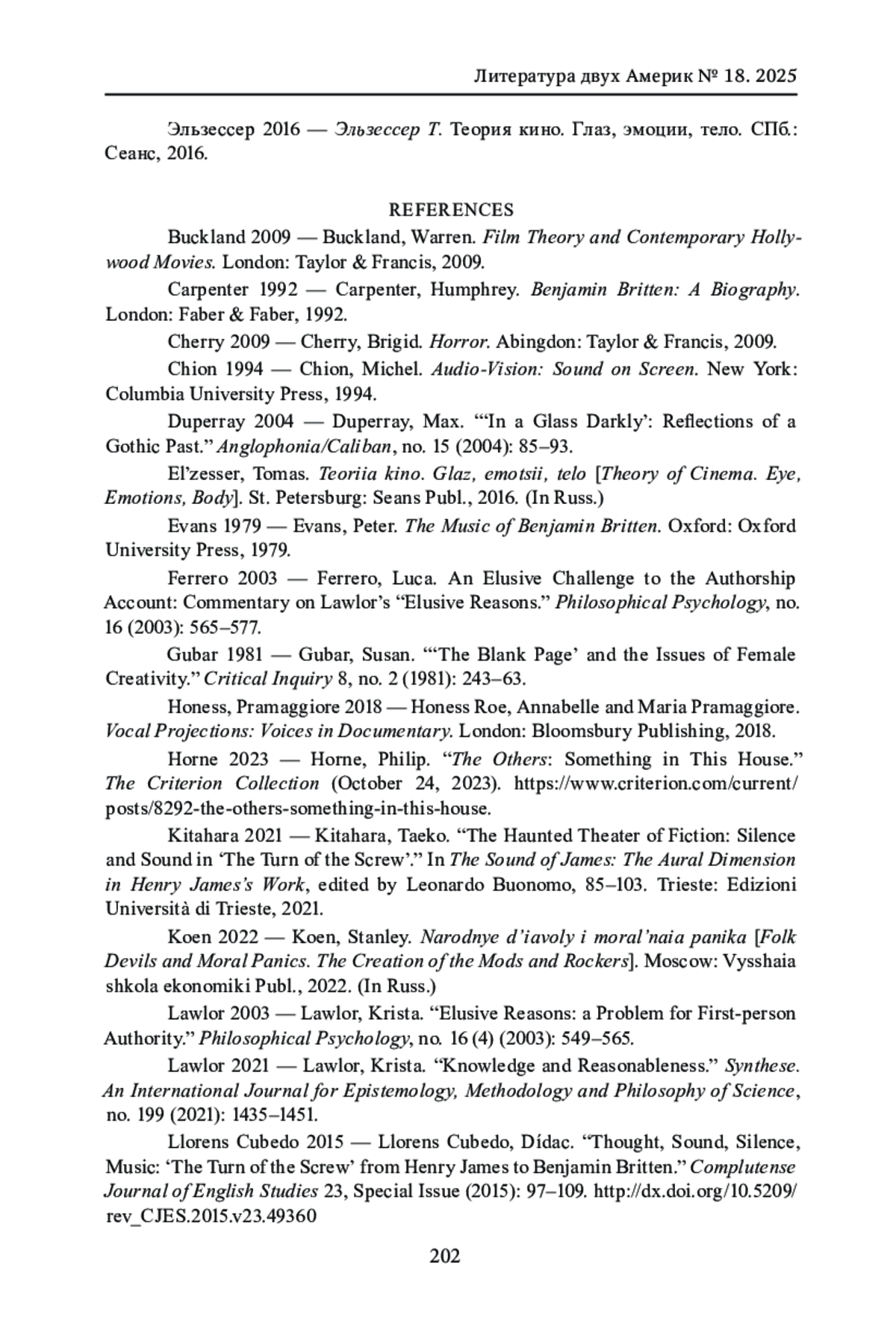 Рассказчица из повести Г. Джеймса «Поворот винта» (“The Turn of the Screw”, 1898), гувернантка в усадьбе Блай, остро чувствует не только нарастающую странность ситуации (явления призраков), но и меняющийся характер ее общения с детьми. У нее складывается ощущение «необычайной атмосферы вокруг» (“the air in which we moved”). В воздухе витает что-то неназываемое (“unnamed”), неприкасаемое (“untouched”), и именно оно - странное нечто - начинает определять их совместную жизнь, подчиняет себе все разговоры и завладевает вниманием. К пониманию неуловимого можно приблизиться, анализируя представление об атмосферности - как повести Джеймса, так и ее трансмедийных адаптаций (в кино, театре). Понятия «атмосферность», «эффекты атмосферности» обсуждаются с опорой на работы неофеноменологов (Г. Шмитц, Г. Беме, Т. Грифферо), теоретиков перформативности (Р. Шехнер, Э. Фишер-Лихте) и современных кинонарратологов (С. Хвен, Р. Уорнер). Основной акцент сделан на «атмосферной перцепции», понятии, введенном Хвеном, для обозначения дорефлексивного «схватывания» зрителем того аффективного заряда, который несет киноповествование. Параллельно рассматривается актуальность представлений об атмосферности в современных адаптационных исследованиях (Л. Хатчен, Т. Лич). Миграция литературного текста в разные медийные среды (кино, театр, видеоигра) связана не столько с варьированием тем и сюжетов, сколько с нюансировкой чувств и настроений (Д. Ричард). Сделан вывод о том, что разговор об атмосферности ведет нас к осознанию явлений, которые Фишер-Лихте предложила рассматривать в русле «нового оволшебствления мира», то есть новой непознаваемости окружающей реальности. Исследуя атмосферность, мы начинаем лучше понимать ограниченность наших возможностей контролировать внешние процессы, при этом сохраняя восприимчивость и свежесть чувств.