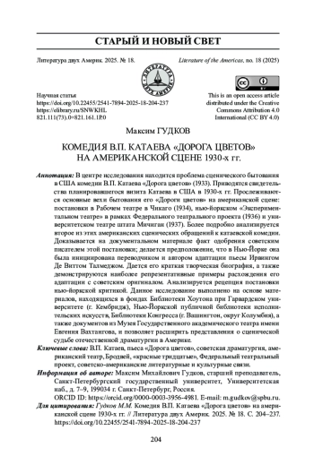 В центре исследования находится проблема сценического бытования в США комедии В. П. Катаева «Дорога цветов» (1933). Приводятся свидетельства планировавшегося визита Катаева в США в 1930-х гг. Прослеживаются основные вехи бытования его «Дороги цветов» на американской сцене: постановки в Рабочем театре в Чикаго (1934), нью-йоркском «Экспериментальном театре» в рамках Федерального театрального проекта (1936) и университетском театре штата Мичиган (1937). Более подробно анализируется второе из этих американских сценических обращений к катаевской комедии. Доказывается на документальном материале факт одобрения советским писателем этой постановки; делается предположение, что в Нью-Йорке она была инициирована переводчиком и автором адаптации пьесы Ирвингом Де Виттом Талмеджом. Дается его краткая творческая биография, а также демонстрируются наиболее репрезентативные примеры расхождения его адаптации с советским оригиналом. Анализируется рецепция постановки нью-йоркской критикой. Данное исследование выполнено на основе материалов, находящихся в фондах Библиотеки Хоутона при Гарвардском университете (г. Кембридж), Нью-Йоркской публичной библиотеки исполнительских искусств, Библиотеки Конгресса (г. Вашингтон, округ Колумбия), а также документов из Музея Государственного академического театра имени Евгения Вахтангова, и позволяет расширить представления о сценической судьбе отечественной драматургии в Америке.