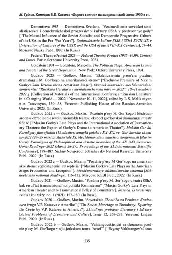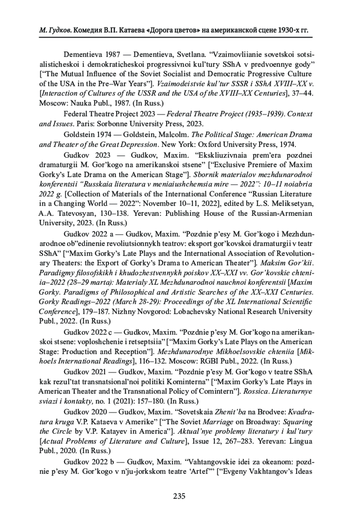 5. Гудков М.М. Поздние пьесы М. Горького в театре США как результат транснациональной политики Коминтерна // Rossica. Литературные связи и контакты. 2021. № 1. С. 157-180. EDN: ADMMWY