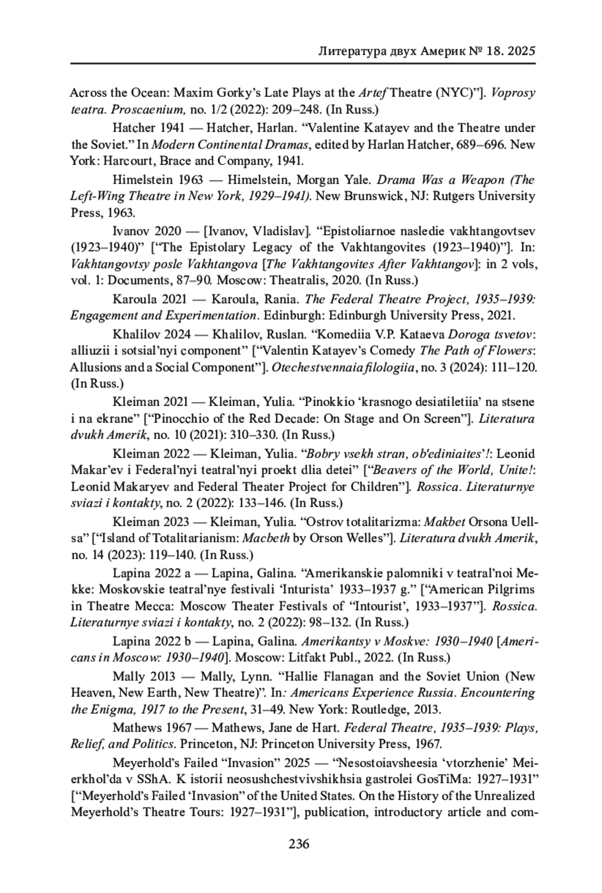 16. Лапина Г.В. Американские паломники в театральной Мекке: Московские театральные фестивали “Интуриста” 1933-1937 г. // Rossica. Литературные связи и контакты. 2022. № 2. C. 98-132. EDN: JDXBSD